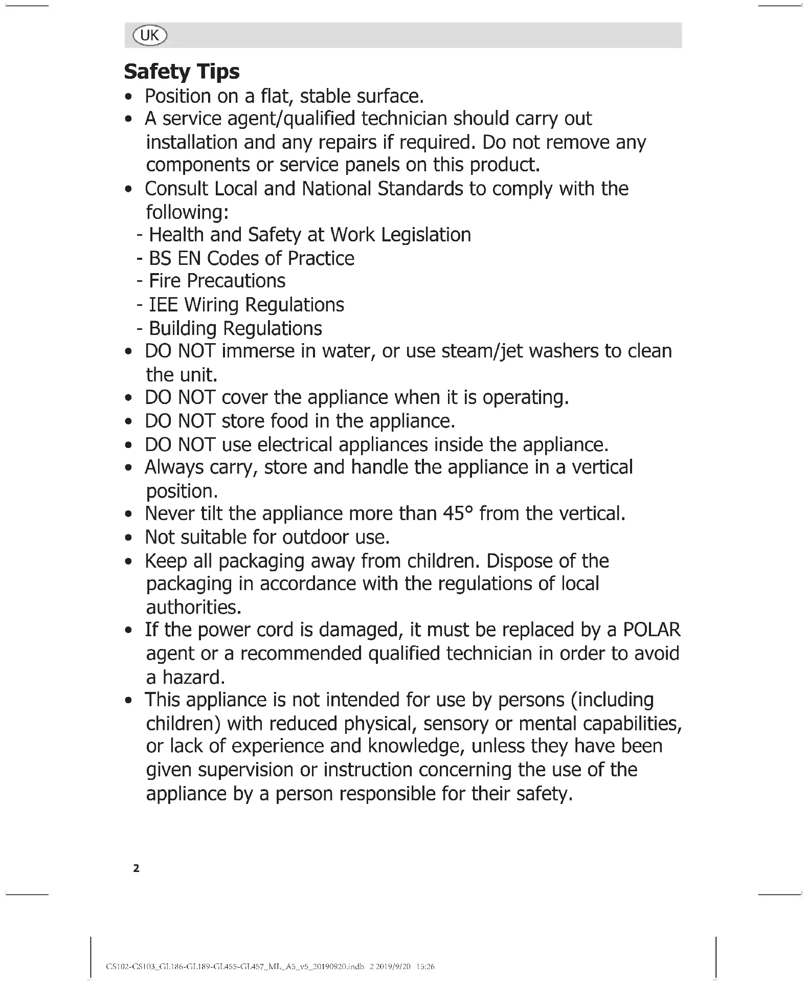 - This appliance is not intended for use by persons (including children) with reduced physical, sensory or mental capabilities, or lack of experience and knowledge, unless they have been given supervision or instruction concerning the use of the appliance by a person responsible for their safety. CS102-CS103_GL186-GL189-GL455-GL457_ML_A5_v5_20190920.indb 2 2019/9/20 15:263