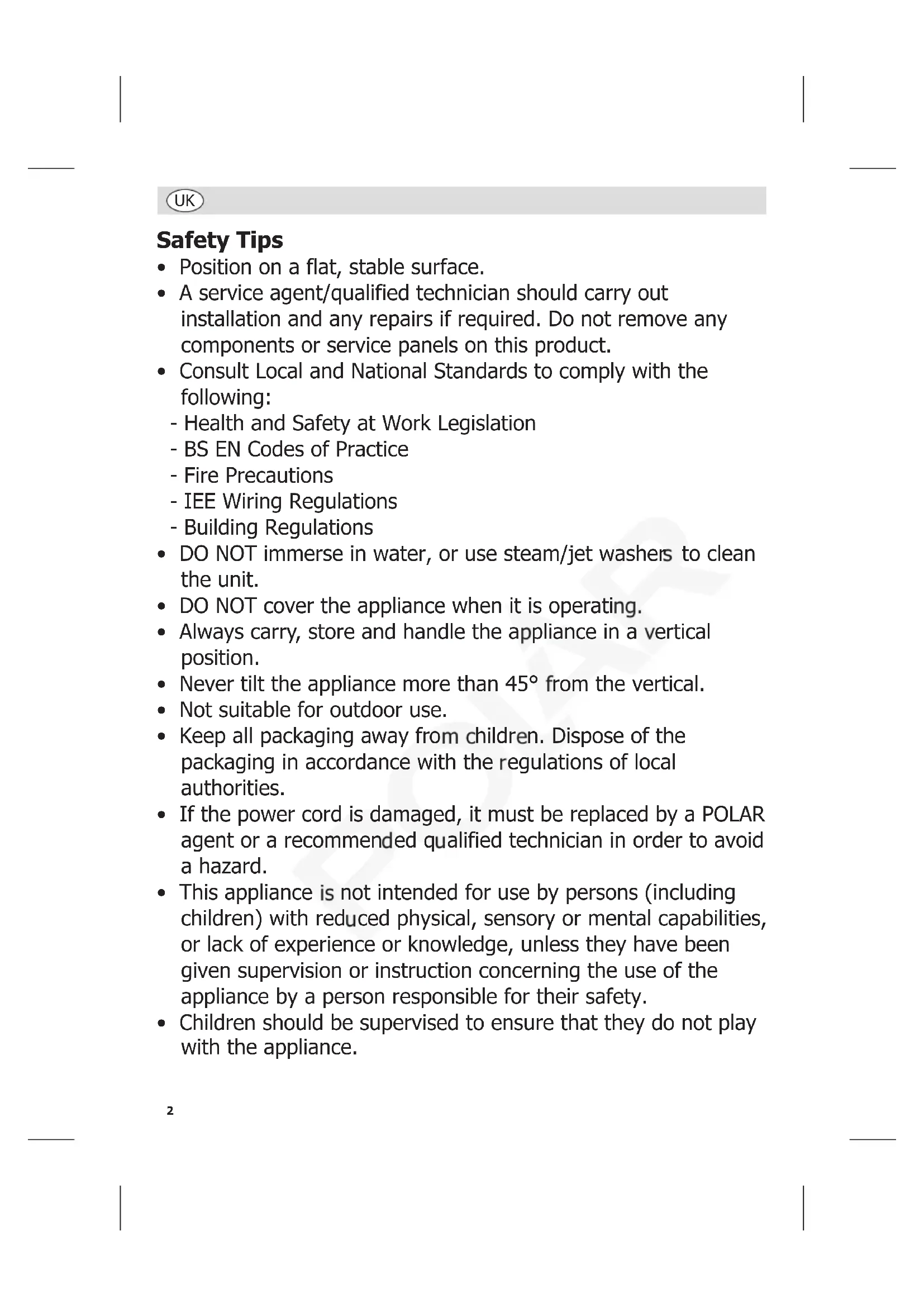 - Polar recommend that this appliance should be periodically tested (at least annually) by a Competent Person. Testing should include, but not be limited to: Visual Inspection, Polarity Test, Earth Continuity, Insulation Continuity and Functional Testing.