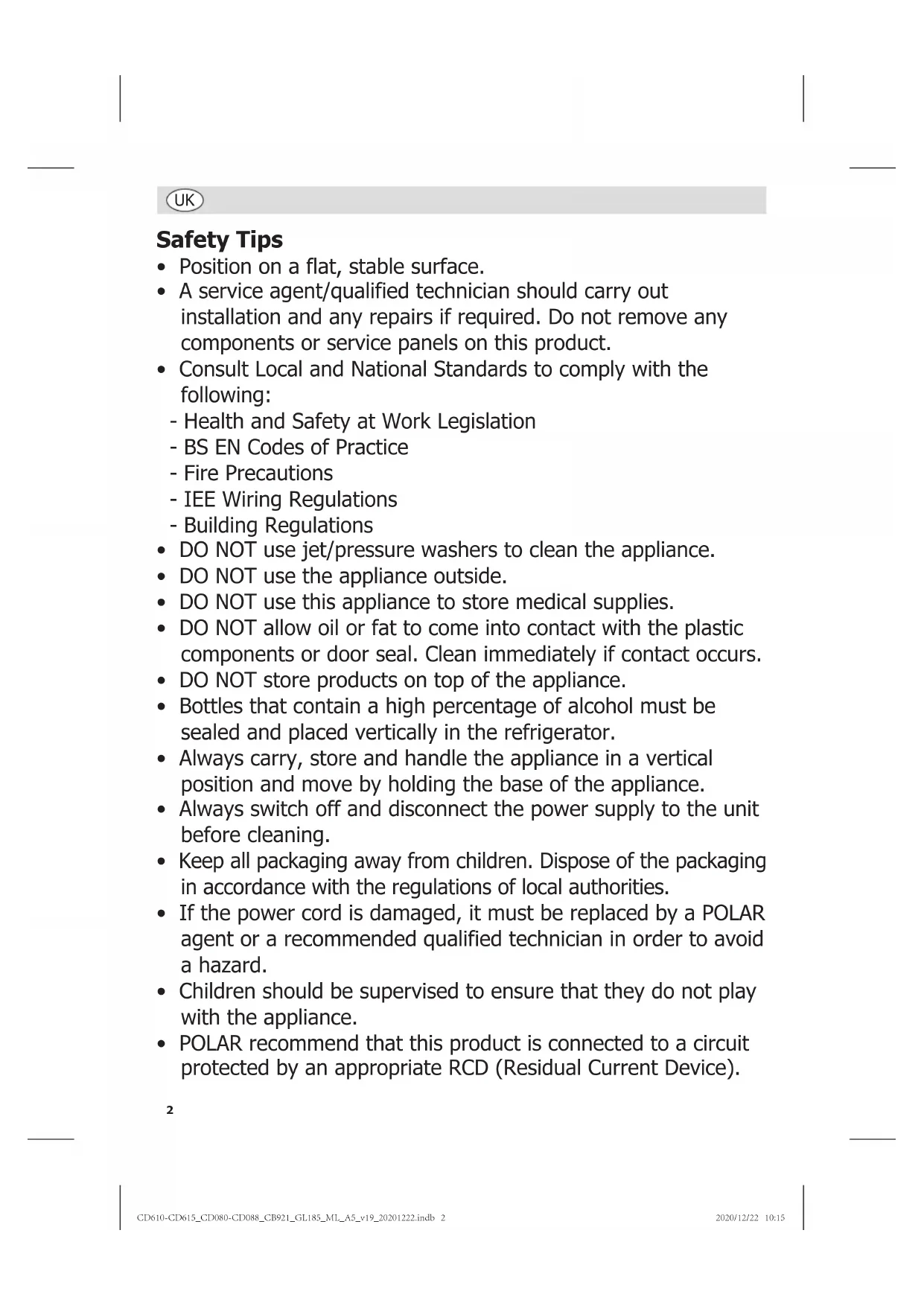 - Earth wire (coloured green/yellow) to terminal marked E This appliance must be earthed. If in doubt consult a qualified electrician. Electrical isolation points must be kept clear of any obstructions. In the event of any emergency disconnection being required they must be readily accessible. Disposal EU regulations require refrigeration product to be disposed of by specialist companies who remove or recycle all gasses, metal and plastic components. Consult your local waste collection authority regarding disposal of your appliance. Local authorities are not obliged to dispose of commercial refrigeration equipment but may be able to offer advice on how to dispose of the equipment locally. Alternatively call the POLAR helpline for details of national disposal companies within the EU. Compliance The WEEE logo on this product or its documentation indicates that the product must not be disposed of as household waste. To help prevent possible harm to human health and/or the environment, the product must be disposed of in an approved and environmentally safe recycling process. For further information on how to dispose of this product correctly, contact the product supplier, or the local authority responsible for waste disposal in your area. POLAR parts have undergone strict product testing in order to comply with regulatory standards and specifications set by international, independent, and federal authorities. POLAR products have been approved to carry the following symbol: All rights reserved. No part of these instructions may be produced or transmitted in any form or by any means, electronic, mechanical, photocopying, recording or otherwise, without the prior written permission of POLAR. Every effort is made to ensure all details are correct at the time of going to press, however, POLAR reserve the right to change specifications without notice. CD610-CD615_CD080-CD088_CB921_GL185_ML_A5_v19_20201222.indb 9CD610-CD615_CD080-CD088_CB921_GL185_ML_A5_v19_20201222.indb 9 2020/12/22 10:152020/12/22 10:1510