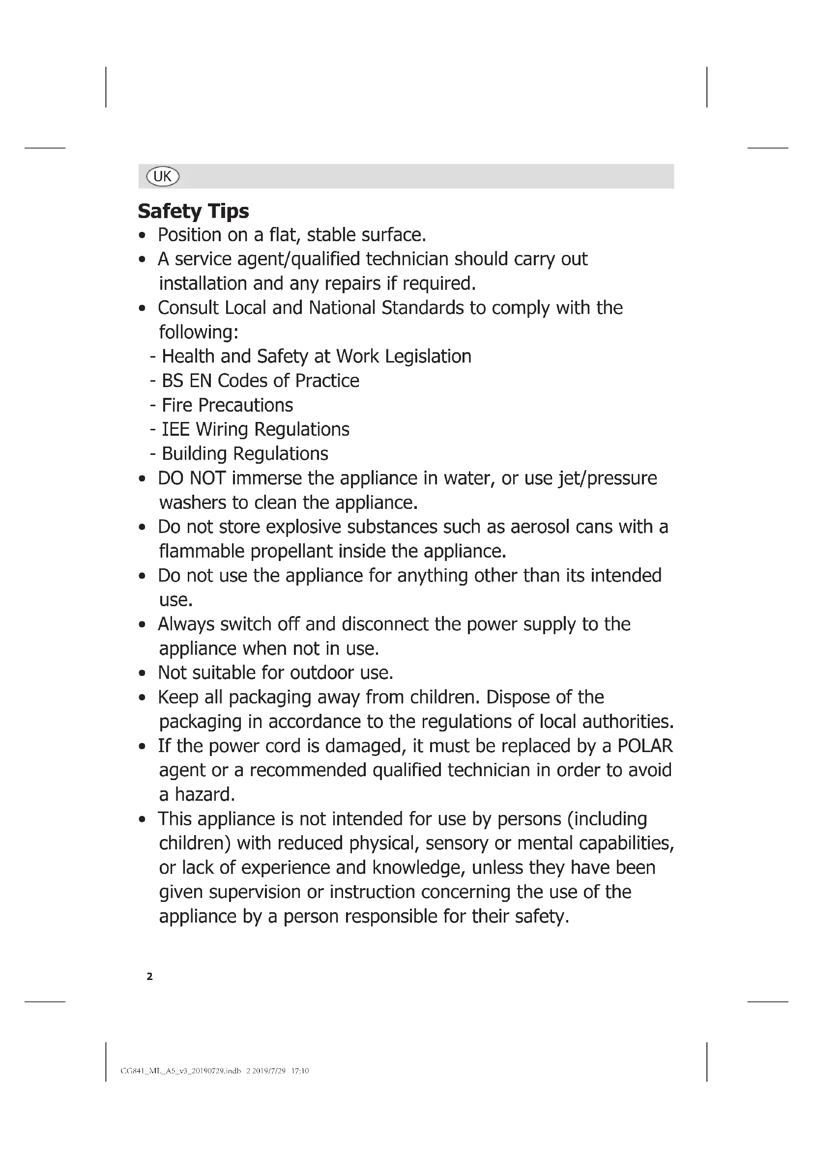 - Earth wire (coloured green/yellow) to terminal marked E This appliance must be earthed. If in doubt consult a qualified electrician. Electrical isolation points must be kept clear of any obstructions. In the event of any emergency disconnection being required they must be readily accessible. Disposal EU regulations require refrigeration product to be disposed of by specialist companies who remove or recycle all gasses, metal and plastic components. Consult your local waste collection authority regarding disposal of your appliance. Local authorities are not obliged to dispose of commercial refrigeration equipment but may be able to offer advice on how to dispose of the equipment locally. Alternatively call the POLAR helpline for details of national disposal companies within the EU. Compliance The WEEE logo on this product or its documentation indicates that the product must not be disposed of as household waste. To help prevent possible harm to human health and/or the environment, the product must be disposed of in an approved and environmentally safe recycling process. For further information on how to dispose of this product correctly, contact the product supplier, or the local authority responsible for waste disposal in your area. POLAR parts have undergone strict product testing in order to comply with regulatory standards and specifications set by international, independent, and federal authorities. POLAR products have been approved to carry the following symbol: All rights reserved. No part of these instructions may be produced or transmitted in any form or by any means, electronic, mechanical, photocopying, recording or otherwise, without the prior written permission of POLAR. Every effort is made to ensure all details are correct at the time of going to press, however, POLAR reserve the right to change specifications without notice. CG841_ML_A5_v3_20190729.indb 7 2019/7/29 17:108