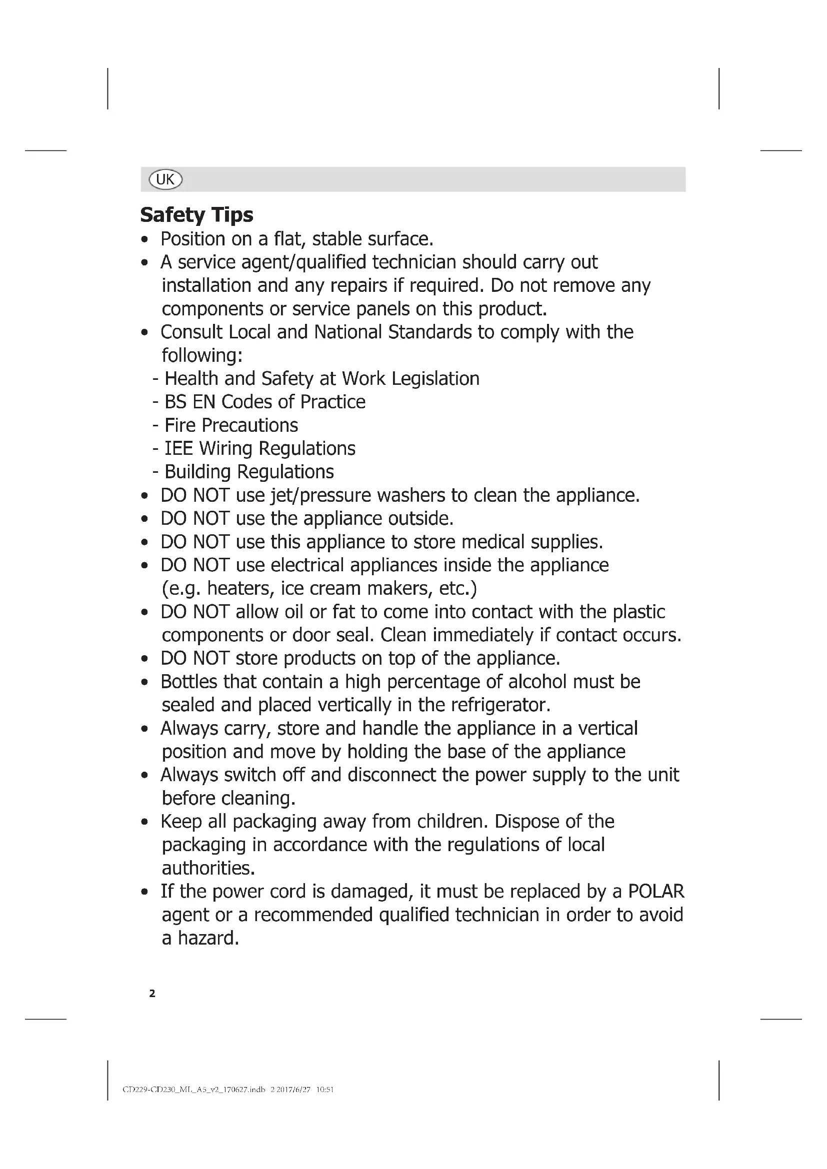 - Earth wire (coloured green/yellow) to terminal marked E This appliance must be earthed. If in doubt consult a qualified electrician. Electrical isolation points must be kept clear of any obstructions. In the event of any emergency disconnection being required they must be readily accessible. Disposal EU regulations require refrigeration product to be disposed of by specialist companies who remove or recycle all gasses, metal and plastic components. Consult your local waste collection authority regarding disposal of your appliance. Local authorities are not obliged to dispose of commercial refrigeration equipment but may be able to offer advice on how to dispose of the equipment locally. Alternatively call the POLAR helpline for details of national disposal companies within the EU. Compliance The WEEE logo on this product or its documentation indicates that the product must not be disposed of as household waste. To help prevent possible harm to human health and/or the environment, the product must be disposed of in an approved and environmentally safe recycling process. For further information on how to dispose of this product correctly, contact the product supplier, or the local authority responsible for waste disposal in your area. POLAR parts have undergone strict product testing in order to comply with regulatory standards and specifications set by international, independent, and federal authorities. POLAR products have been approved to carry the following symbol: All rights reserved. No part of these instructions may be produced or transmitted in any form or by any means, electronic, mechanical, photocopying, recording or otherwise, without the prior written permission of POLAR. Every effort is made to ensure all details are correct at the time of going to press, however, POLAR reserve the right to change specifications without notice. CD229-CD230_ML_A5_v2_170627.indb 7 2017/6/27 10:518