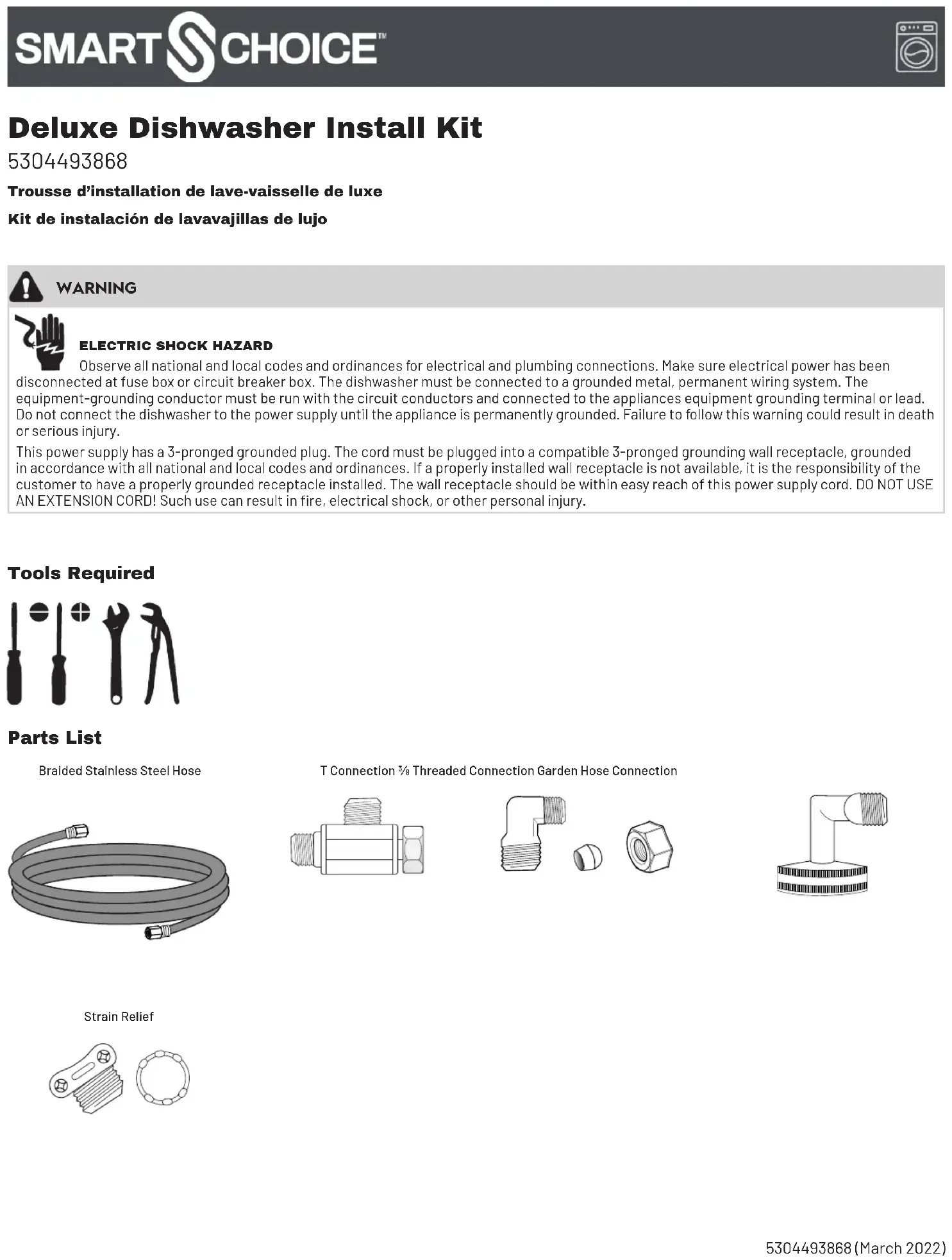 Observe all national and local codes and ordinances for electrical and plumbing connections. Make sure electrical power has been disconnected at fuse box or circuit breaker box. The dishwasher must be connected to a grounded metal, permanent wiring system. The equipment-grounding conductor must be run with the circuit conductors and connected to the appliances equipment grounding terminal or lead. Do not connect the dishwasher to the power supply until the appliance is permanently grounded. Failure to follow this warning could result in death or serious injury. This power supply has a 3-pronged grounded plug. The cord must be plugged into a compatible 3-pronged grounding wall receptacle, grounded in accordance with all national and local codes and ordinances. If a properly installed wall receptacle is not available, it is the responsibility of the customer to have a properly grounded receptacle installed. The wall receptacle should be within easy reach of this power supply cord. DO NOT USE AN EXTENSION CORD! Such use can result in re, electrical shock, or other personal injury. Braided Stainless Steel HoseStrain ReliefT Connection ⅜ Threaded Connection Garden Hose ConnectionInstallation ⅜" Threaded Connection A. Wrap the threads of the elbow with two turns of sealant tape provided in the kit to ensure a leak-proof connection. B. Connect and tighten the threaded end of the elbow to the inlet water valve on the dishwasher. C. Run the braided stainless steel waterline to the underside of the dishwasher. D. Remove and discard the compression nut and compression ferrule from the elbow installed in step B. E. Connect the ⅜” compression nut on the braided stainless steel waterline to the elbow installed in step B above. Garden Hose Connection F. Verify that the hose washer is in the elbow before installing. G. Connect the garden hose elbow to the dishwasher inlet valve. Do NOT use the sealant tape on the dishwasher inlet valve. H. Hand tighten the garden hose elbow on the dishwasher inlet valve and add a ¼ turn.