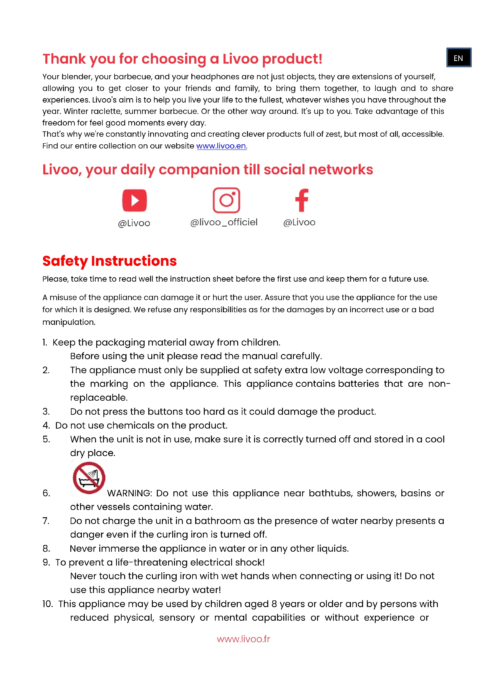 reduced physical, sensory or mental capabilities or without experience or @livoo_officiel @Livoo @Livoo ENwww.livoo.fr knowledge, if they are properly supervised or if they have been given instructions on how to use the appliance safely and if the risks involved are understood.