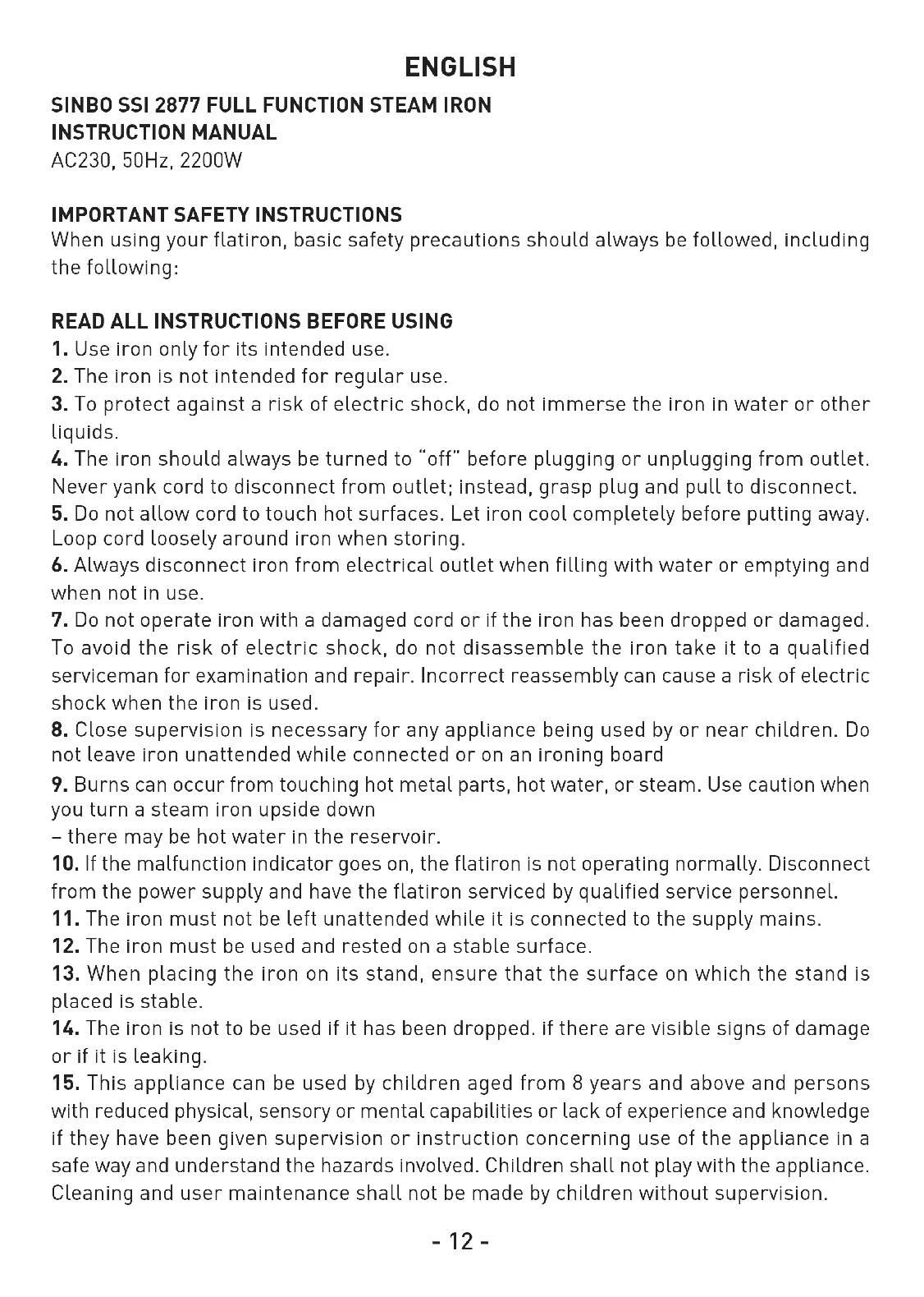 SSI 2877 - Iron SINBO - Free user manual and instructions