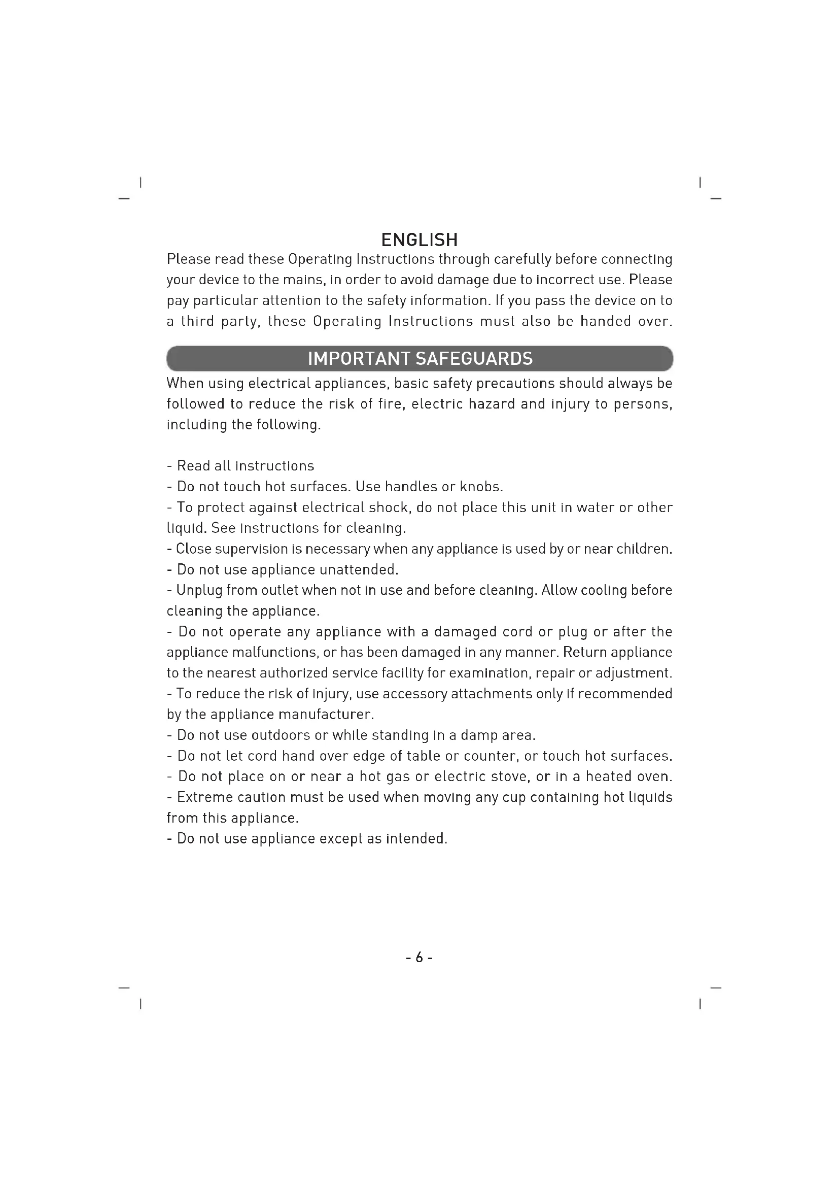 - Ambalaj üzerindeki iflaretlemelere uyunuz. C‹HAZI KULLANMADI⁄INIZ ZAMAN MUHAKKAK F‹fi‹N‹ PR‹ZDEN ÇEK‹N‹Z. TAfiIMA ESNASINDA Bu cihaz kalite belgesine haizdir. EN 60335-2-15 Kullanım Ömrü 7 yıldır. Made in P.R.C.- 6 - ENGLISH Please read these Operating Instructions through carefully before connecting your device to the mains, in order to avoid damage due to incorrect use. Please pay particular attention to the safety information. If you pass the device on to a third party, these Operating Instructions must also be handed over. When using electrical appliances, basic safety precautions should always be followed to reduce the risk of fire, electric hazard and injury to persons, including the following. - Read all instructions - Do not touch hot surfaces. Use handles or knobs. - To protect against electrical shock, do not place this unit in water or other liquid. See instructions for cleaning. - Close supervision is necessary when any appliance is used by or near children. - Do not use appliance unattended. - Unplug from outlet when not in use and before cleaning. Allow cooling before cleaning the appliance. - Do not operate any appliance with a damaged cord or plug or after the appliance malfunctions, or has been damaged in any manner. Return appliance to the nearest authorized service facility for examination, repair or adjustment. - To reduce the risk of injury, use accessory attachments only if recommended by the appliance manufacturer. - Do not use outdoors or while standing in a damp area. - Do not let cord hand over edge of table or counter, or touch hot surfaces. - Do not place on or near a hot gas or electric stove, or in a heated oven. - Extreme caution must be used when moving any cup containing hot liquids from this appliance. - Do not use appliance except as intended. IMPORTANT SAFEGUARDS- 7 - TECHNICAL SPECIFICATION Operating voltage : 230V~ Frequency : 50Hz Power consumption : 350W Cooking time : 8-12 min.