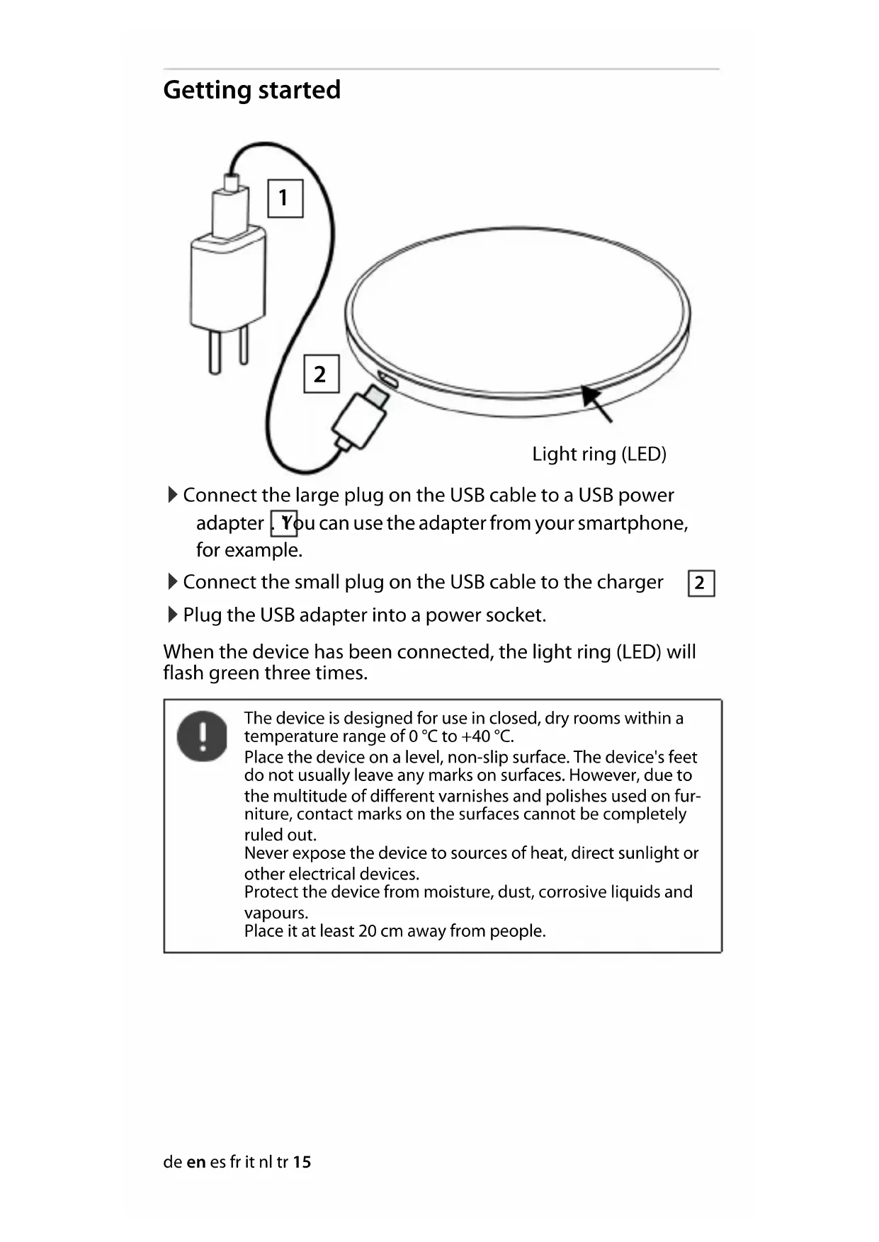 - Do not place any magnetically sensitive objects or cards with magnetic strips (EC cards, credit cards etc) on the charger. This can damage the data on the cards or even delete it completely.