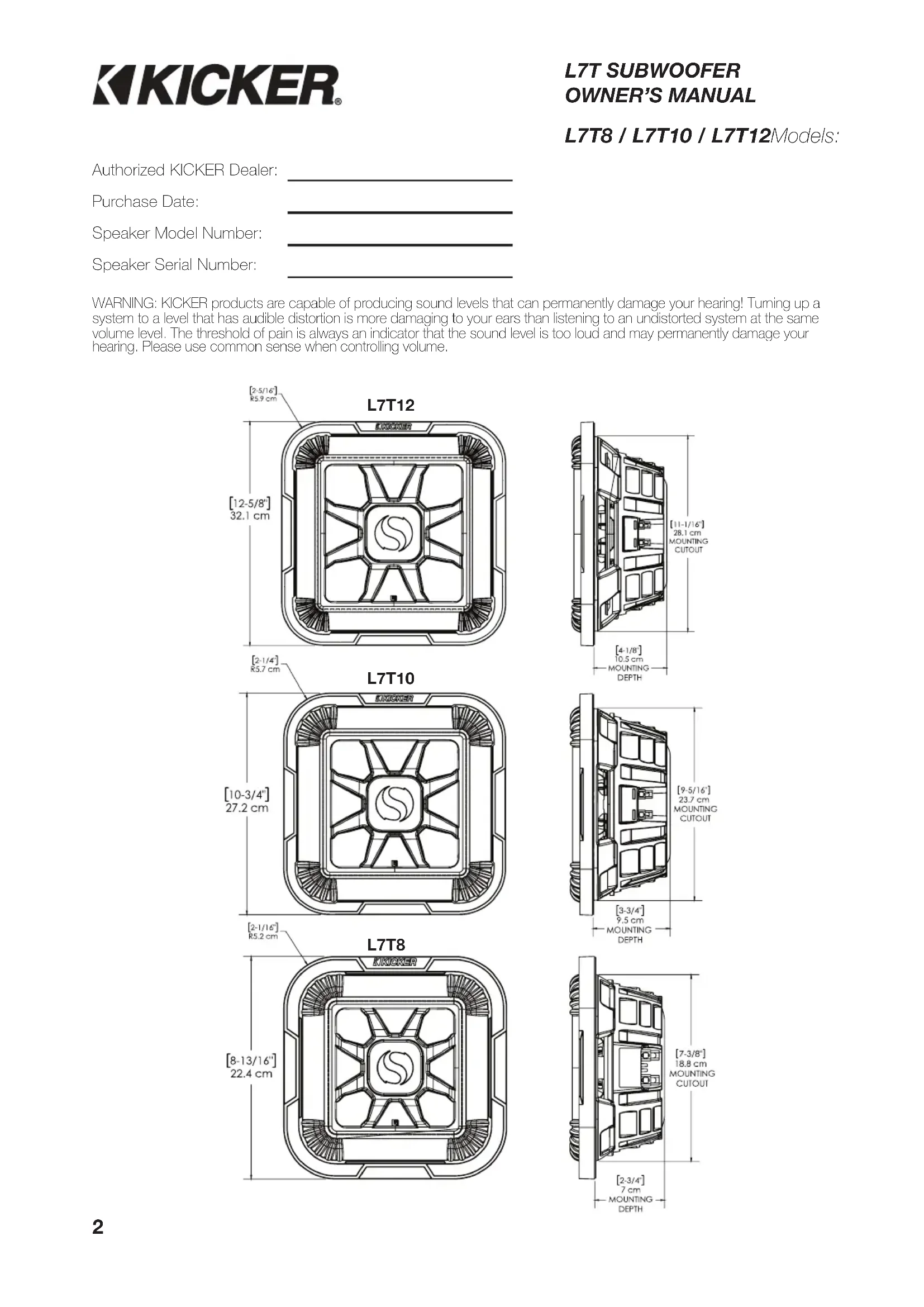 Download the instructions for your Subwoofer in PDF format for free! Find your manual L7T102 - KICKER and take your electronic device back in hand. On this page are published all the documents necessary for the use of your device. L7T102 by KICKER.