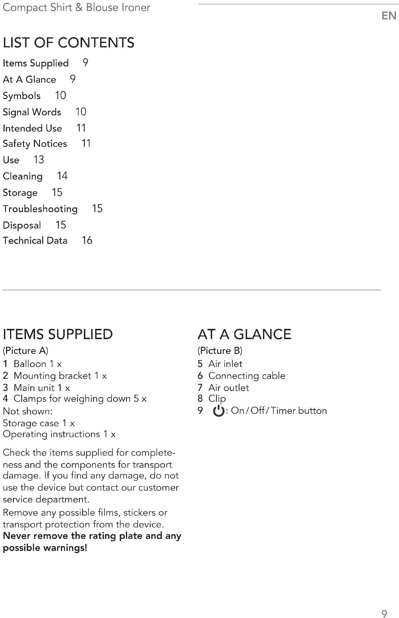 Items Supplied 9 At A Glance 9 Symbols 10 Signal Words 10 Intended Use 11 Safety Notices 11 Use 13 Cleaning 14 Storage 15 Troubleshooting 15 Disposal 15 Technical Data 16 ITEMS SUPPLIED (Picture A) 1 Balloon 1 x 2 Mounting bracket 1 x 3 Main unit 1 x 4 Clamps for weighing down 5 x Not shown: Storage case 1 x Operating instructions 1 x Check the items supplied for complete- ness and the components for transport damage. If you find any damage, do not use the device but contact our customer service department. Remove any possible films, stickers or transport protection from the device. Never remove the rating plate and any possible warnings!