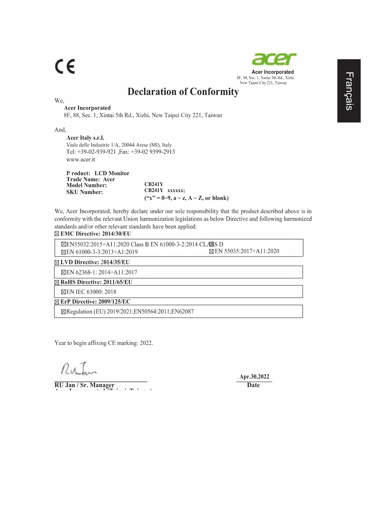 RU Jan / Sr. Manager Date Acer Incorporated (Taipei, Taiwan) EN55032:2015+A11:2020 Class B EN 61000-3-2:2014 CLASS D EN 55035:2017+A11:2020 EN 61000-3-3:2013+A1:2019Français Federal Communications Commission Supplier's Declaration of Conformity This device complies with Part 15 of the FCC Rules. Operation is subject to the following two conditions: (1) this device may not cause harmful interference, and (2) this device must accept any interference received, including interference that may cause undesired operation. The following local Manufacturer /Importer is responsible for this declaration: Product: LCD Monitor Model Number: CB241Y SKU Number: CB241Y xxxxxx (“x” = 0~9, a ~ z, A ~ Z, or blank) Name of Responsible Party: Acer America Corporation Address of Responsible Party: 333 West San Carlos St. Suite 1500 San Jose, CA 95110 U. S. A. Contact Person: Acer Representative Phone No.: 254-298-4000 Fax No.: 254-298-4147 Acer America Corporation 333 West San Carlos St., San Jose Suite 1500 CA 95110, U. S. A. Tel : 254-298-4000 Fax : 254-298-4147 www.acer.comFrançais TCO Certied A third-party certification according to ISO 14024 Say hello to a more sustainable product IT products are associated with a wide range of sustainability risks throughout their life cycle. Human rights violations are common in the factories. Harmful substances are used both in products and their manufacture. Products can often have a short lifespan because of poor ergonomics, low quality and when they are not able to be repaired or upgraded. This product is a better choice. It meets all the criteria in TCO Certified, the world’s most comprehensive sustainability certification for IT products. Thank you for making a responsible product choice, that help drive progress towards a more sustainable future! Criteria in TCO Certified have a life-cycle perspective and balance environmental and social responsibility. Conformity is verified by independent and approved verifiers that specialize in IT products, social responsibility or other sustainability issues. Verification is done both before and after the certificate is issued, covering the entire validity period. The process also includes ensuring that corrective actions are implemented in all cases of factory non-conformities. And last but not least, to make sure that the certification and independent verification is accurate, both TCO Certified and the verifiers are reviewed regularly. Want to know more? Read information about TCO Certified, full criteria documents, news and updates at tcocertified.com. On the website you’ll also find our Product Finder, which presents a complete, searchable listing of certified products. Toward sustainable IT productsFrançais Table des matières Informations relatives à votre sécurité et à votre confort