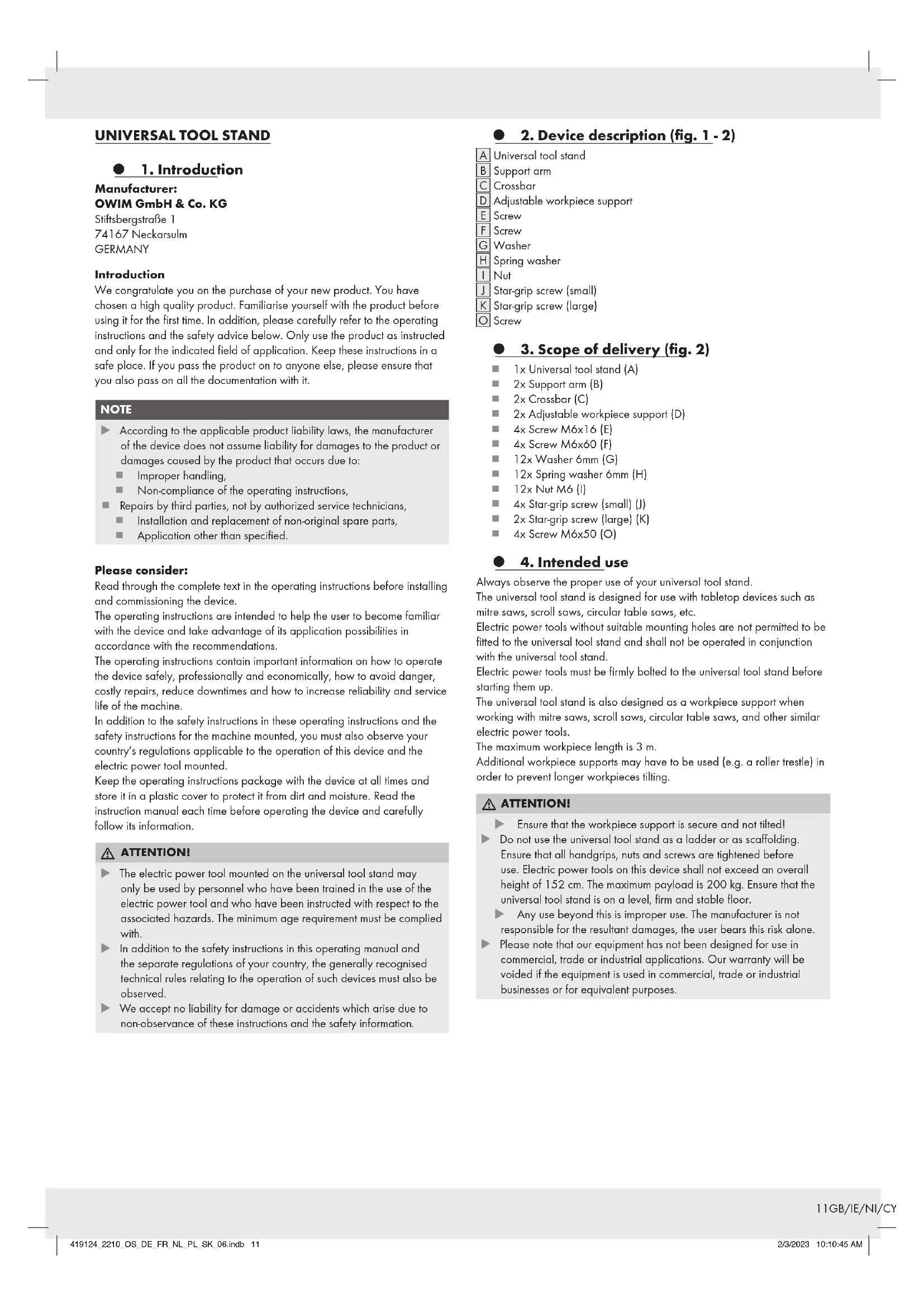 ATTENTION! u Ensure that the workpiece support is secure and not tilted! u Do not use the universal tool stand as a ladder or as scaffolding. Ensure that all handgrips, nuts and screws are tightened before use. Electric power tools on this device shall not exceed an overall height of 152 cm. The maximum payload is 200 kg. Ensure that the universal tool stand is on a level, firm and stable floor. u Any use beyond this is improper use. The manufacturer is not responsible for the resultant damages, the user bears this risk alone. u Please note that our equipment has not been designed for use in commercial, trade or industrial applications. Our warranty will be voided if the equipment is used in commercial, trade or industrial businesses or for equivalent purposes. 419124_2210_OS_DE_FR_NL_PL_SK_06.indb 11419124_2210_OS_DE_FR_NL_PL_SK_06.indb 11 2/3/2023 10:10:45 AM2/3/2023 10:10:45 AM12 GB/IE/NI/CY/MT
