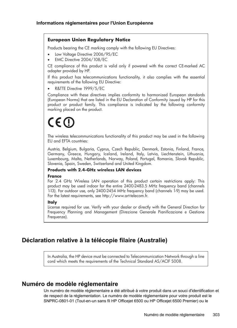 Numéro de modèle réglementaire Un numéro de modèle réglementaire a été attribué à votre produit dans un souci d'identification et de respect de la réglementation. Le numéro de modèle réglementaire pour votre produit est le SNPRC-0801-01 (Tout-en-un sans fil HP Officejet 6500 ou HP Officejet 6500 Premier) ou le Numéro de modèle réglementaire