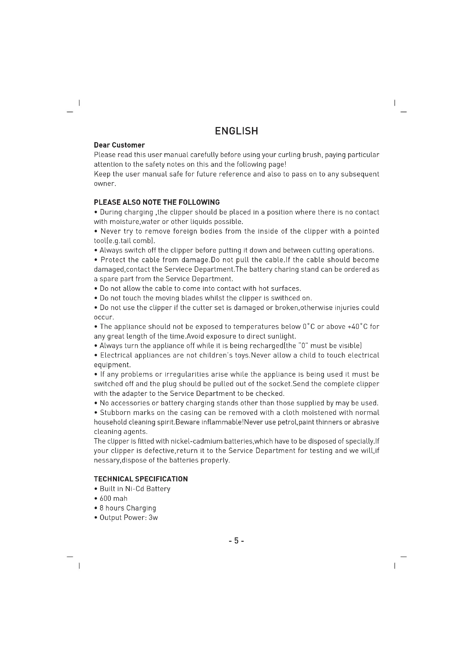 - Stubborn marks on the casing can be removed with a cloth moistened with normal household cleaning spirit.Beware inflammable!Never use petrol,paint thinners or abrasive cleaning agents. The clipper is fitted with nickel-cadmium batteries,which have to be disposed of specially.If your clipper is defective,return it to the Service Department for testing and we will,if nessary,dispose of the batteries properly. TECHNICAL SPECIFICATION