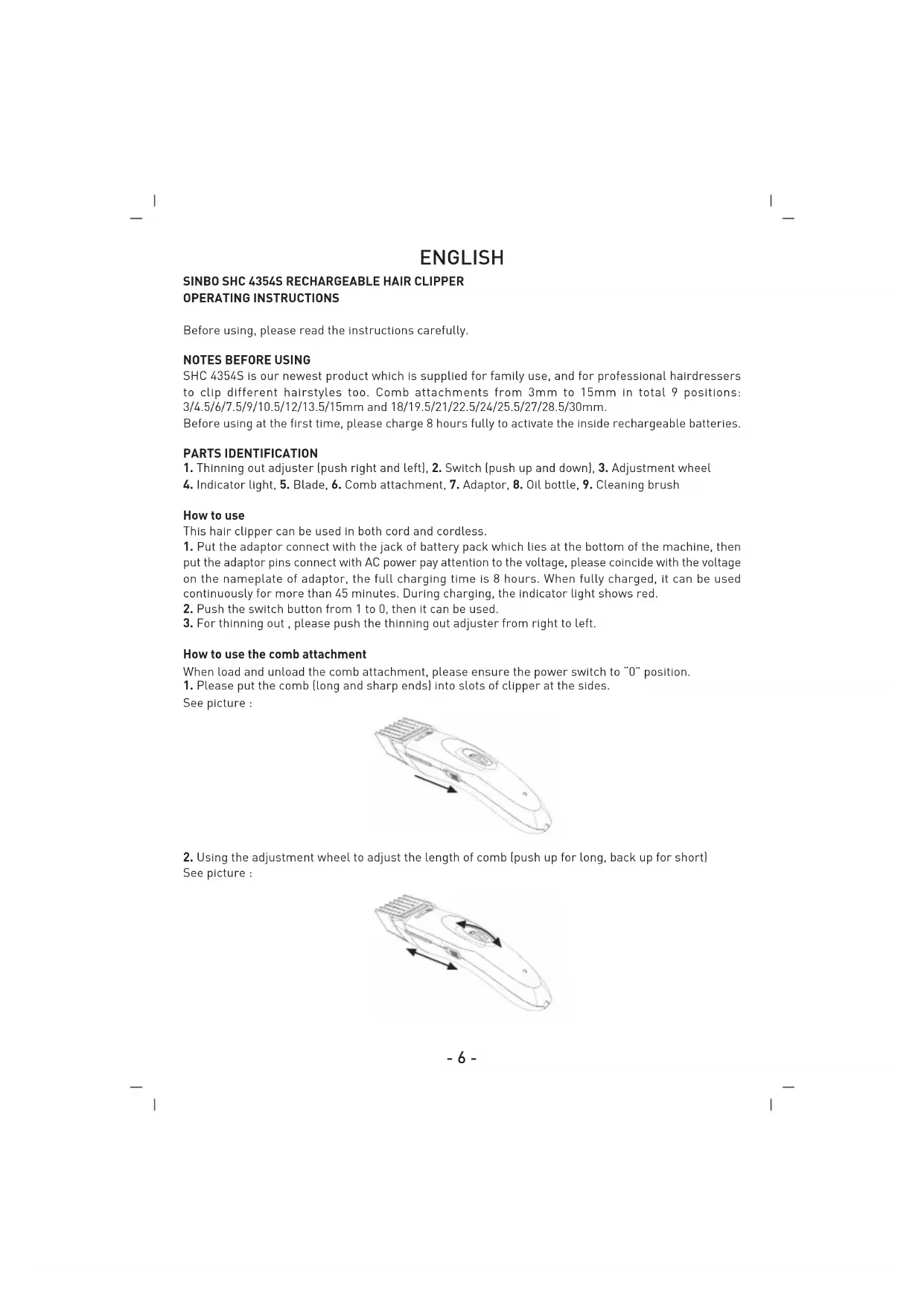 SHC 4354S is our newest product which is supplied for family use, and for professional hairdressers to clip different hairstyles too. Comb attachments from 3mm to 15mm in total 9 positions: 3/4.5/6/7.5/9/10.5/12/13.5/15mm and 18/19.5/21/22.5/24/25.5/27/28.5/30mm. Before using at the first time, please charge 8 hours fully to activate the inside rechargeable batteries. PARTS IDENTIFICATION