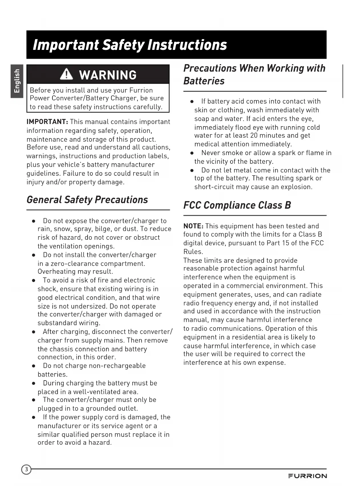 - Troubleshooting Important Safety Instructions English WARNING Before you install and use your Furrion Power Converter/Battery Charger, be sure to read these safety instructions carefully. IMPORTANT: This manual contains important information regarding safety, operation, maintenance and storage of this product. Before use, read and understand all cautions, warnings, instructions and production labels, plus your vehicle’s battery manufacturer guidelines. Failure to do so could result in injury and/or property damage. General Safety Precautions ● Do not expose the converter/charger to rain, snow, spray, bilge, or dust. To reduce risk of hazard, do not cover or obstruct the ventilation openings. ● Do not install the converter/charger in a zero-clearance compartment. Overheating may result. ● To avoid a risk of fire and electronic shock, ensure that existing wiring is in good electrical condition, and that wire size is not undersized. Do not operate the converter/charger with damaged or substandard wiring. ● After charging, disconnect the converter/ charger from supply mains. Then remove the chassis connection and battery connection, in this order. ● Do not charge non-rechargeable batteries. ● During charging the battery must be placed in a well-ventilated area. ● The converter/charger must only be plugged in to a grounded outlet. ● If the power supply cord is damaged, the manufacturer or its service agent or a similar qualified person must replace it in order to avoid a hazard. Precautions When Working with Batteries ● If battery acid comes into contact with skin or clothing, wash immediately with soap and water. If acid enters the eye, immediately flood eye with running cold water for at least 20 minutes and get medical attention immediately. ● Never smoke or allow a spark or flame in the vicinity of the battery. ● Do not let metal come in contact with the top of the battery. The resulting spark or short-circuit may cause an explosion. FCC Compliance Class B NOTE: This equipment has been tested and found to comply with the limits for a Class B digital device, pursuant to Part 15 of the FCC Rules. These limits are designed to provide reasonable protection against harmful interference when the equipment is operated in a commercial environment. This equipment generates, uses, and can radiate radio frequency energy and, if not installed and used in accordance with the instruction manual, may cause harmful interference to radio communications. Operation of this equipment in a residential area is likely to cause harmful interference, in which case the user will be required to correct the interference at his own expense.4 About your Product English How your Converter Works The Furrion Power Converter/Battery Charger converts 120Vac to 13.6Vdc. As a power supply, it allows the user to operate any 12 volt nominal DC load up to the converter’s rated output current for resistance load and allows less than ⁄ load of inductive load. As a battery charger, the converter will maintain the battery, delivering its full-rated current when the battery capacity falls sufficiently low. The voltage is set to deliver its maximum current for the necessary period of time that minimizes undue stress to the battery caused by the heating of its cells. This helps to ensure the longest possible life of the battery. Over time, as the battery nears its full capacity, the converter will float-charge the battery to prevent self-discharge of its cells. Operational Features ● Converter/charger ratings up to 60Amps for model FCVSDC60A and 80Amps for model FCVSDC80A. ● Easy access reverse battery protection fuses. ● Intelligent fan speed control. ● Intelligent thermal de-rating & cut off protection. ● Battery Maintenance-free – every 21 days start a new charge cycle. ● Multiple charge status to keep your battery in good condition. The Furrion power converter/battery charger is designed with high-quality components to help ensure years of continuous use. REVERSE POLARITY PROTECTION - If a battery is accidentally hooked up backwards, the converter will be protected by fuse. OVER VOLTAGE PROTECTION - If the Input Voltage exceeds a preset limit, the converter will shut-down to prevent damage. The unit will return to normal operation when the voltage returns to normal. OVER CURRENT PROTECTION - Cycle-by- cycle peak limiting as well as rated current limiting to maximize the life of the converter. SHORT CIRCUIT PROTECTION - The power converter/battery charger senses within millionths of a second if the output terminals have been shorted. If this condition should occur the converter first limits the current. Should the condition continue to exist the converter then reduces the current output, within thousandths of a second. The power converter/battery charger is designed to protect itself. Once the “short circuit” has been corrected the power converter/battery charger will automatically return to normal operating condition. OVERTEMPERATURE PROTECTION - If an over temperature condition should occur due to air flow obstruction or improper installation, the power converter/battery charger senses the condition and decreases power output until the unit returns to normal operating temperature. Full output capacity will return as the unit cools.5 Product Overview English Front Panel Fuse (Automotive Type 287) Ground Wire Terminal Positive + (Red) Fur Bus Negative - (Black) Rear Panel Cable and Plug6 Installation English What’s in the Box Make sure you have all the following items included in the packaging. If any item is damaged or missing, contact your dealer. − Power Converter/Battery Charger x 1 − Instruction Manual x 1 − Warranty Card x 1 Mounting Location The Furrion power converter/battery charger can be mounted in any position within an enclosed compartment. Provide sufficient air space to allow unrestricted airflow in and around the unit. The power converter should be installed in