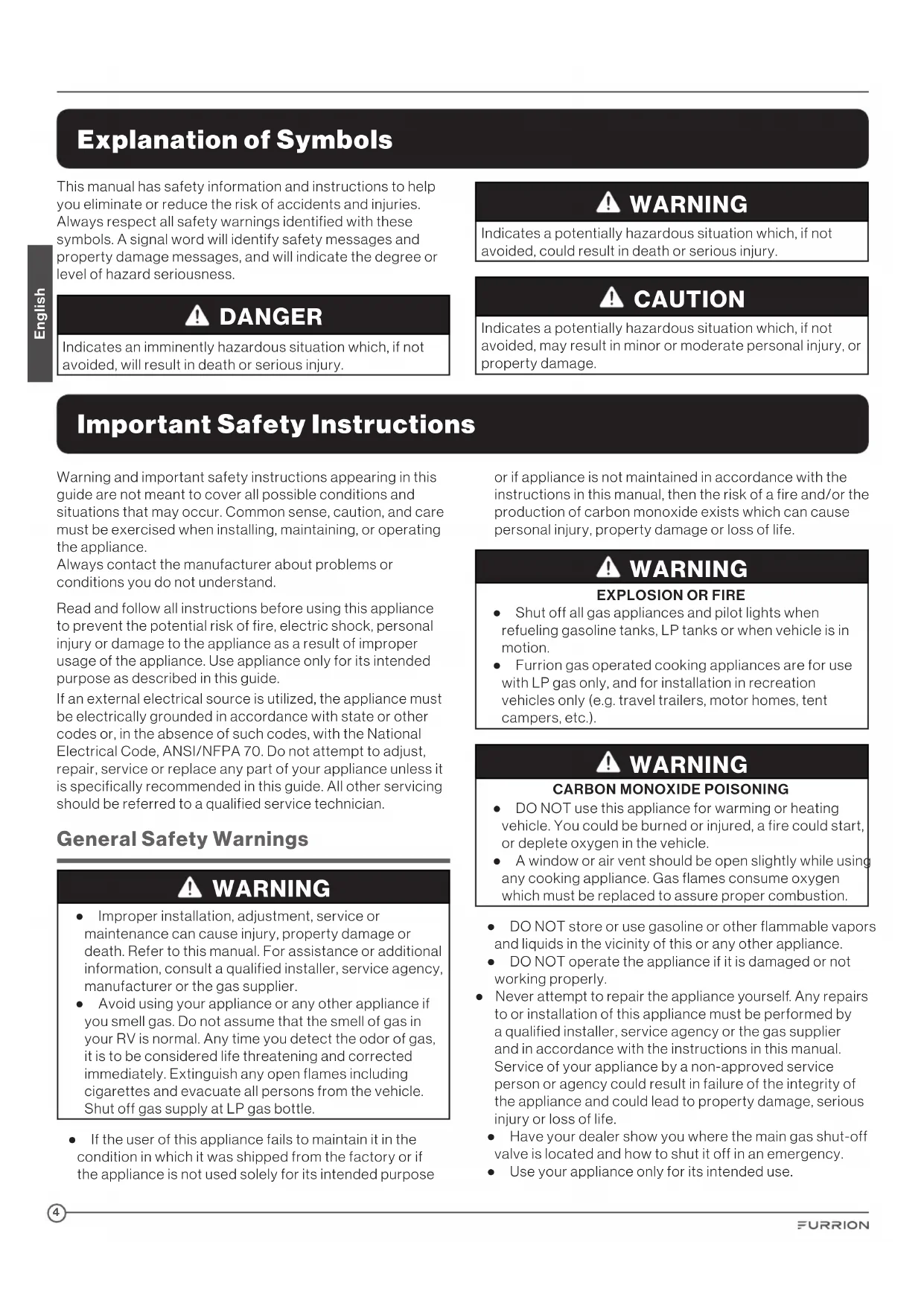 ● Shut off all gas appliances and pilot lights when refueling gasoline tanks, LP tanks or when vehicle is in motion. ● Furrion gas operated cooking appliances are for use with LP gas only, and for installation in recreation vehicles only (e.g. travel trailers, motor homes, tent campers, etc.). WARNING