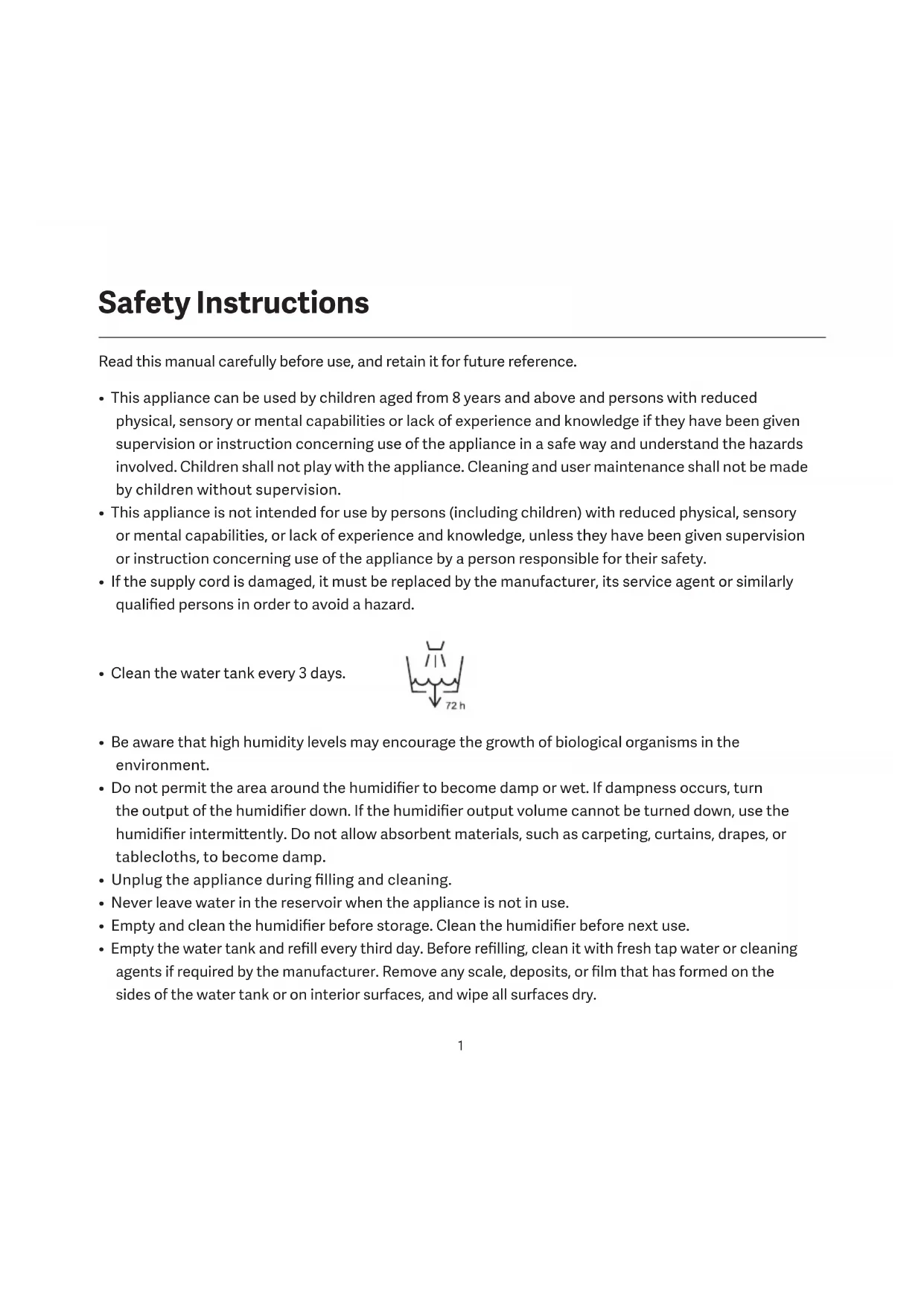 Safety Instructions• WARNING: Micro-organisms that may be present in the water or in the environment where the appliance is used or stored, can grow in the reservoir and be blown in the air causing very serious health risks when the water is not renewed and the tank is not cleaned properly every 3 days.