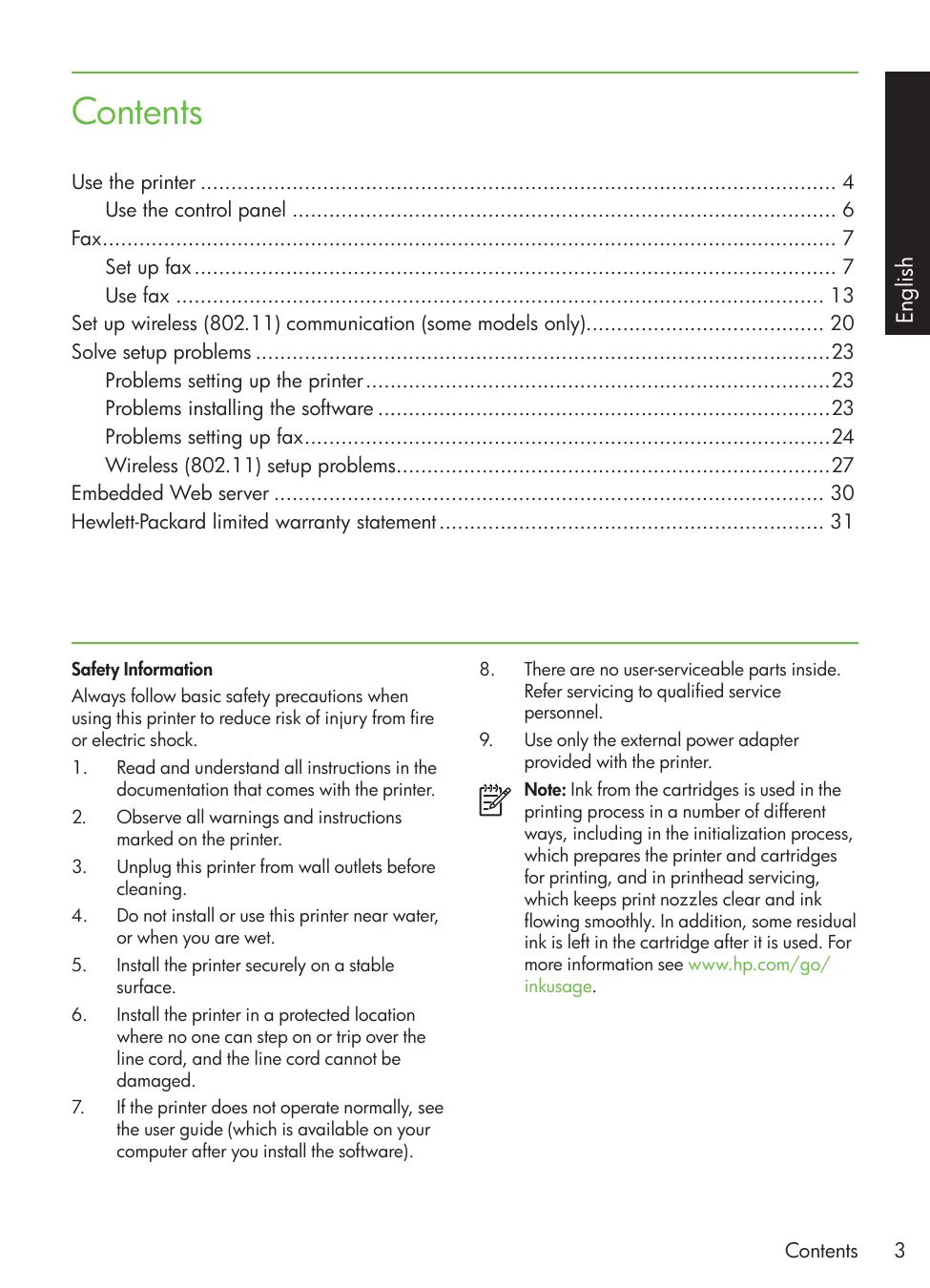 8. There are no user-serviceable parts inside. Refer servicing to qualified service personnel. 9. Use only the external power adapter provided with the printer. Note: Ink from the cartridges is used in the printing process in a number of different ways, including in the initialization process, which prepares the printer and cartridges for printing, and in printhead servicing, which keeps print nozzles clear and ink flowing smoothly. In addition, some residual ink is left in the cartridge after it is used. For more information see www.hp.com/go/ inkusage.