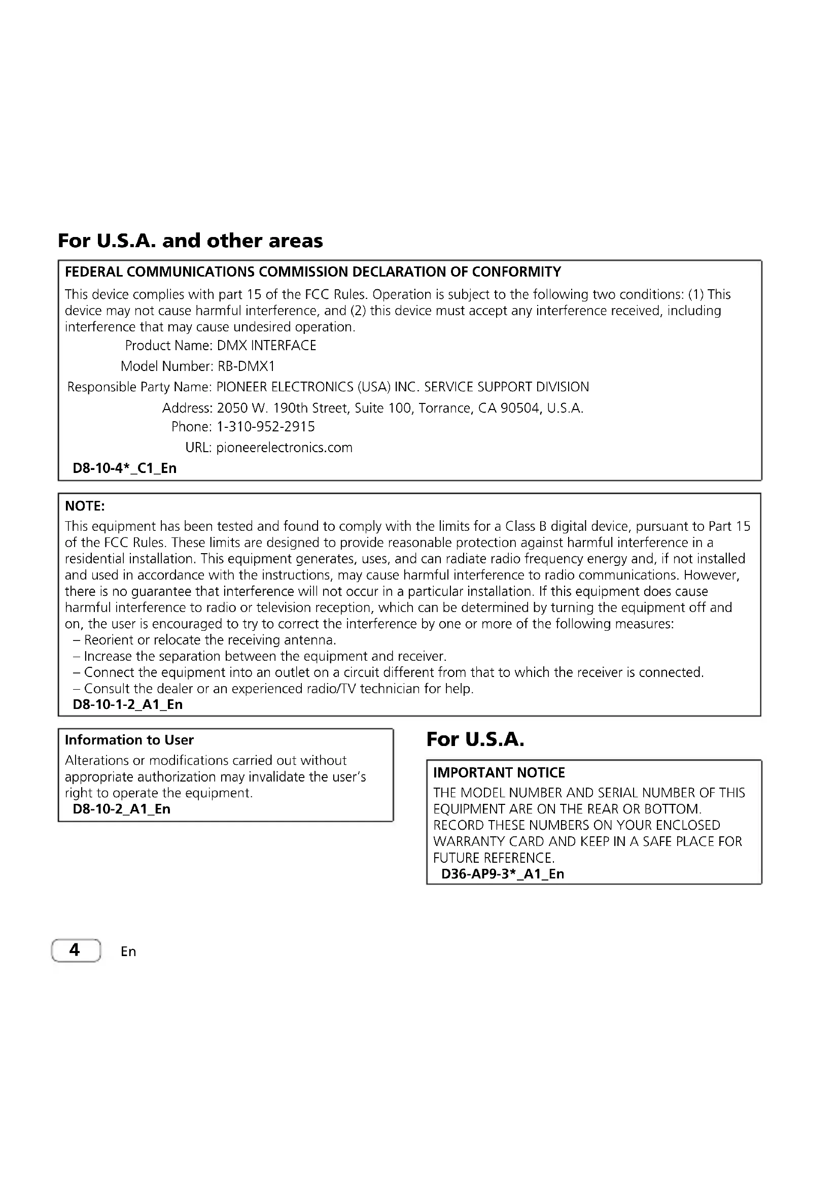 This device complies with part 15 of the FCC Rules. Operation is subject to the following two conditions: (1) This device may not cause harmful interference, and (2) this device must accept any interference received, including interference that may cause undesired operation. Product Name: DMX INTERFACE Model Number: RB-DMX1 Responsible Party Name: PIONEER ELECTRONICS (USA) INC. SERVICE SUPPORT DIVISION Address: 2050 W. 190th Street, Suite 100, Torrance, CA 90504, U.S.A. Phone: 1-310-952-2915 URL: pioneerelectronics.com D8-10-4*_C1_En NOTE: This equipment has been tested and found to comply with the limits for a Class B digital device, pursuant to Part 15 of the FCC Rules. These limits are designed to provide reasonable protection against harmful interference in a residential installation. This equipment generates, uses, and can radiate radio frequency energy and, if not installed and used in accordance with the instructions, may cause harmful interference to radio communications. However, there is no guarantee that interference will not occur in a particular installation. If this equipment does cause harmful interference to radio or television reception, which can be determined by turning the equipment off and on, the user is encouraged to try to correct the interference by one or more of the following measures: – Reorient or relocate the receiving antenna. – Increase the separation between the equipment and receiver. – Connect the equipment into an outlet on a circuit different from that to which the receiver is connected. – Consult the dealer or an experienced radio/TV technician for help. D8-10-1-2_A1_En Information to User Alterations or modifications carried out without appropriate authorization may invalidate the user’s right to operate the equipment. D8-10-2_A1_En For U.S.A. IMPORTANT NOTICE THE MODEL NUMBER AND SERIAL NUMBER OF THIS EQUIPMENT ARE ON THE REAR OR BOTTOM.