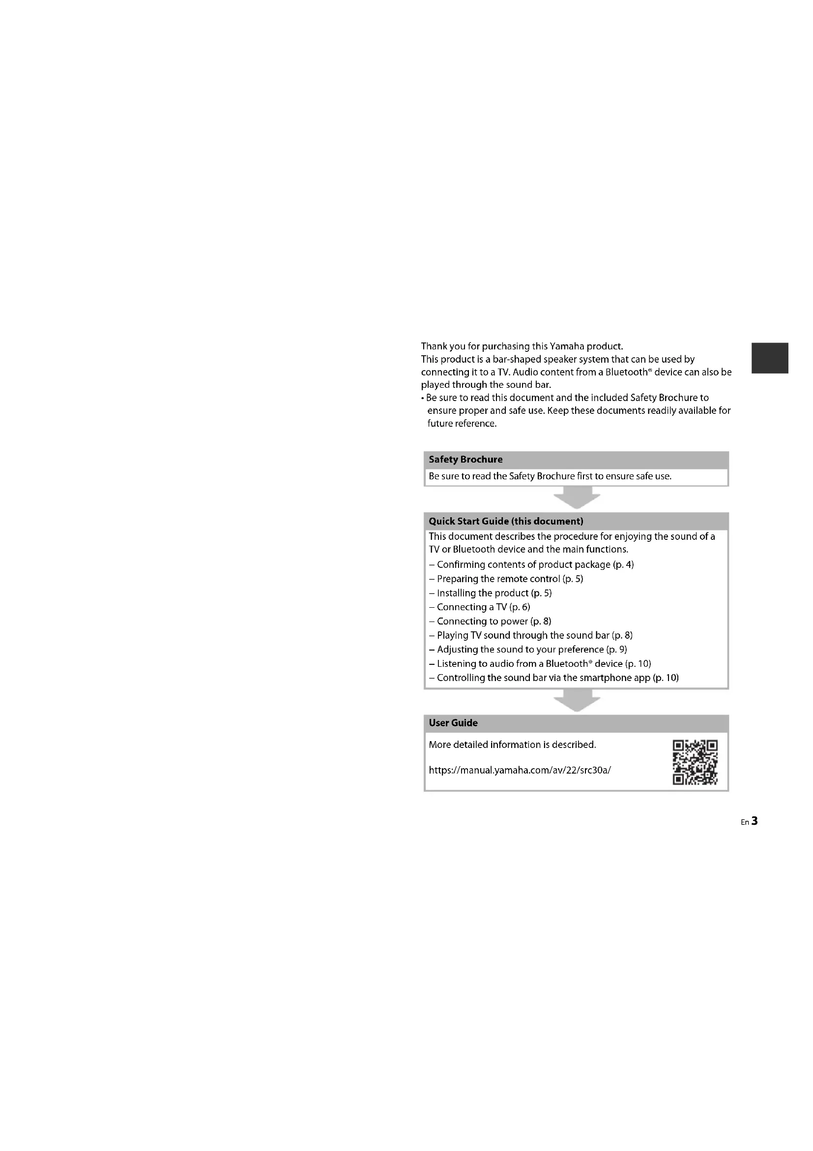 - Be sure to read this document and the included Safety Brochure to ensure proper and safe use. Keep these documents readily available for future reference. Safety Brochure Be sure to read the Safety Brochure first to ensure safe use. Quick Start Guide (this document) This document describes the procedure for enjoying the sound of a TV or Bluetooth device and the main functions. − Confirming contents of product package (p. 4) − Preparing the remote control (p. 5) − Installing the product (p. 5) − Connecting a TV (p. 6) − Connecting to power (p. 8) − Playing TV sound through the sound bar (p. 8) − Adjusting the sound to your preference (p. 9) − Listening to audio from a Bluetooth® device (p. 10) − Controlling the sound bar via the smartphone app (p. 10) User Guide More detailed information is described. https://manual.yamaha.com/av/22/src30a/ Quick Start Guide EN4 En This product includes the following main devices and accessories. Take out all items from the box and make sure that all items are present. Confirming contents of product package Sound bar (SR-CUC30A) Remote control Digital optical audio cable Power cords (×2) Mounting template Spacers (A: ×2, B: ×2 on 1 sheet) NOTE