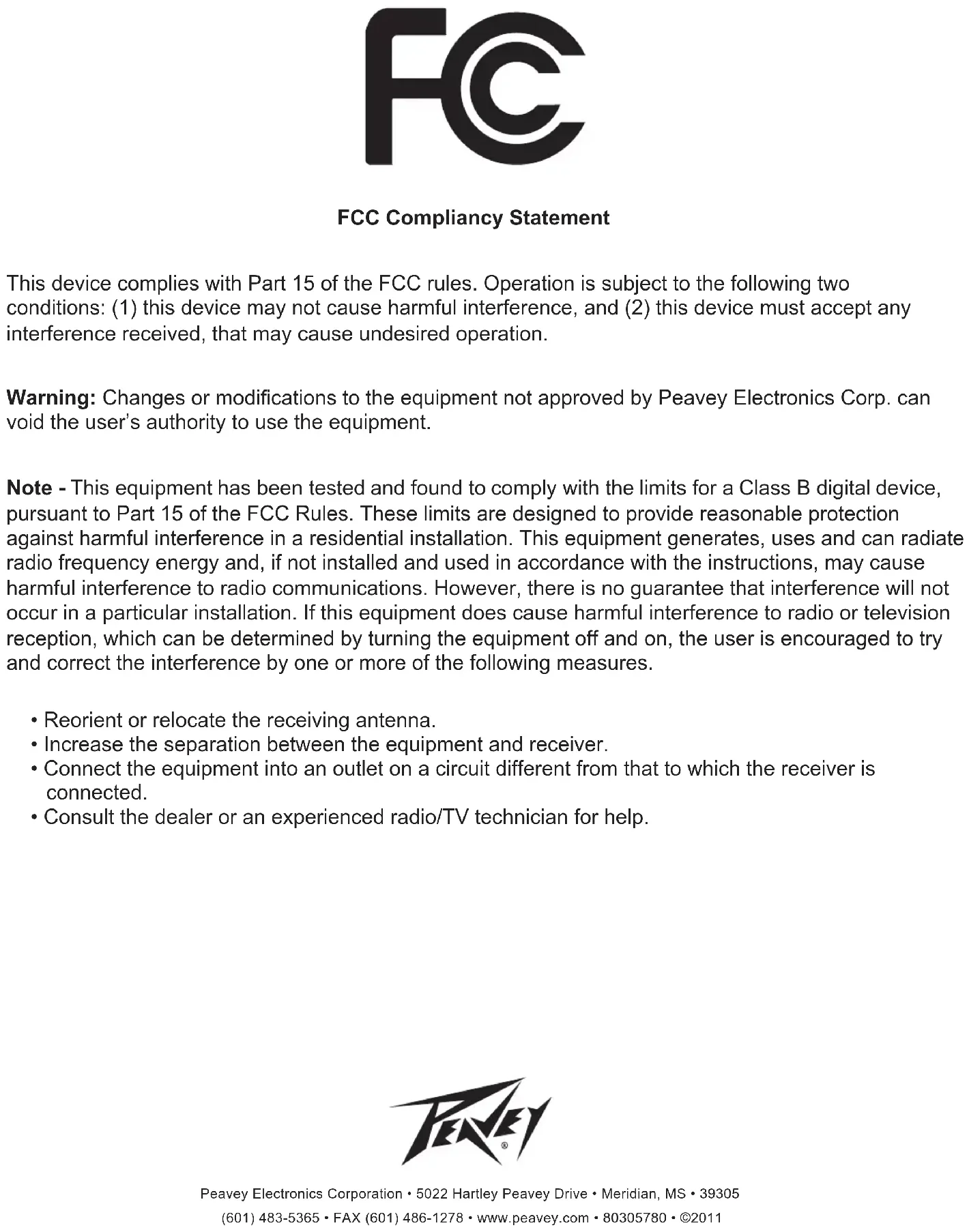 Warning: Changes or modications to the equipment not approved by Peavey Electronics Corp. can