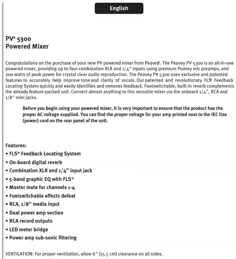 Congratulations on the purchase of your new PV powered mixer from Peavey. The Peavey PV 5300 is an all-in-one powered mixer, providing up to four combination XLR and 1/4 inputs using premium Peavey mic preamps, and 200 watts of peak power for crystal clear audio reproduction. The Peavey PV 5300 uses exclusive and patented features to accurately help improve tone and clarity of vocals. Our patented and revolutionary FLS Feedback Locating System quickly and easily identifies and removes feedback. Footswitchable, built-in reverb complements the already feature-packed unit. Connect almost anything to this versatile mixer via the onboard 1/4 ", RCA and 1/8 mini jacks.