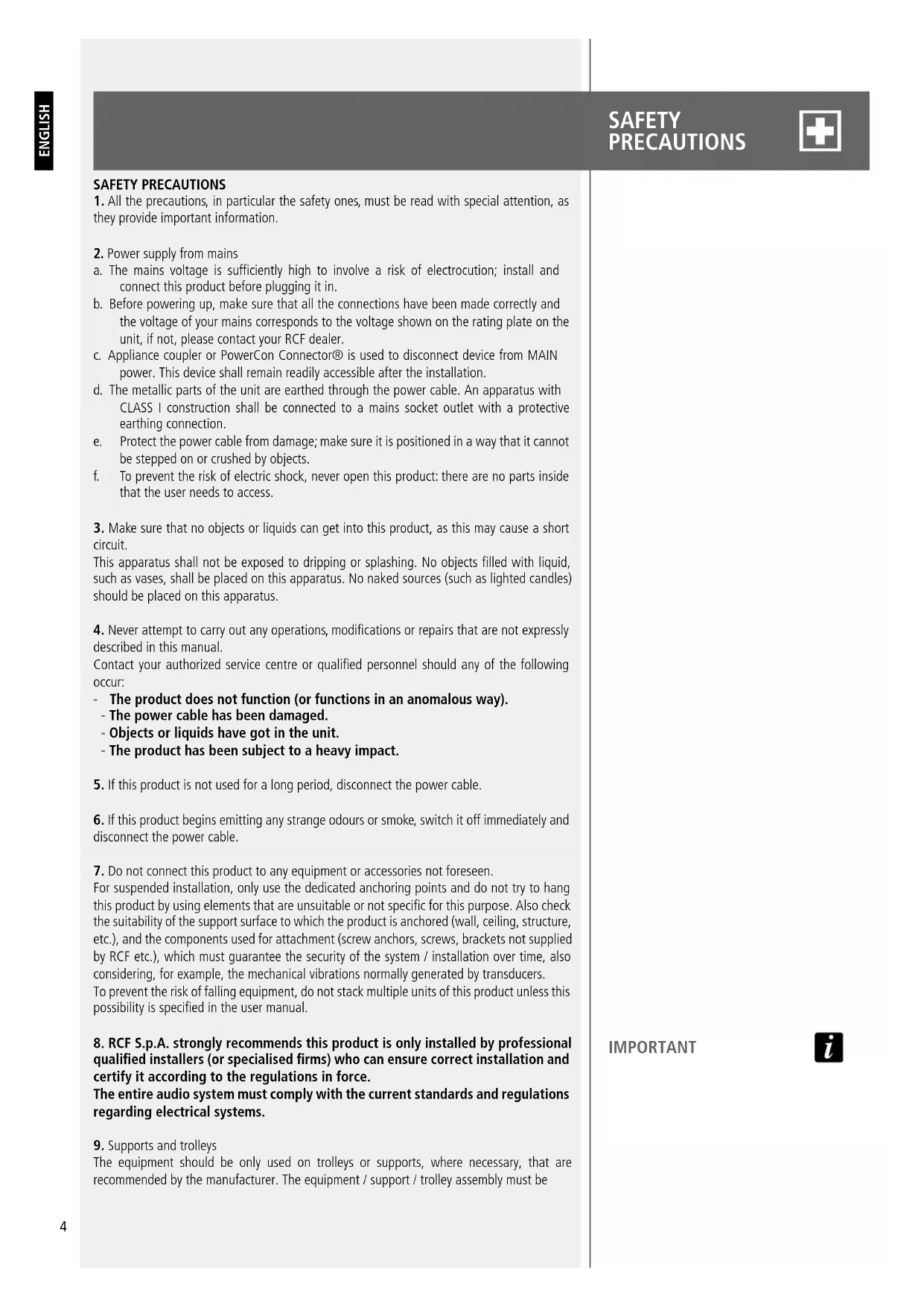 Exposure to high sound levels can cause permanent hearing loss. The acoustic pressure level that leads to hearing loss is different from person to person and depends on the duration of exposure. To prevent potentially dangerous exposure to high levels of acoustic pressure, anyone who is exposed to these levels should use adequate protection devices. When a transducer capable of producing high sound levels is being used, it is therefore necessary to wear ear plugs or protective earphones. See the manual technical specifications to know the maximum sound pressure level. IMPORTANT NOTES To prevent the occurrence of noise on line signal cables, use screened cables only and avoid putting them close to: - Equipment that produces high-intensity electromagnetic fields - Power cables - Loudspeaker lines. OPERATING PRECAUTIONS - Place this product far from any heat sources and always ensure an adequate air circulation around it. - Do not overload this product for a long time. - Never force the control elements (keys, knobs, etc. ). - Do not use solvents, alcohol, benzene or other volatile substances for cleaning the external parts of this product. IMPORTANT NOTES Before connecting and using this product, please read this instruction manual carefully and keep it on hand for future reference. The manual is to be considered an integral part of this product and must accompany it when it changes ownership as a reference for correct installation and use as well as for the safety precautions. RCF S.p.A. will not assume any responsibility for the incorrect installation and / or use of this product.