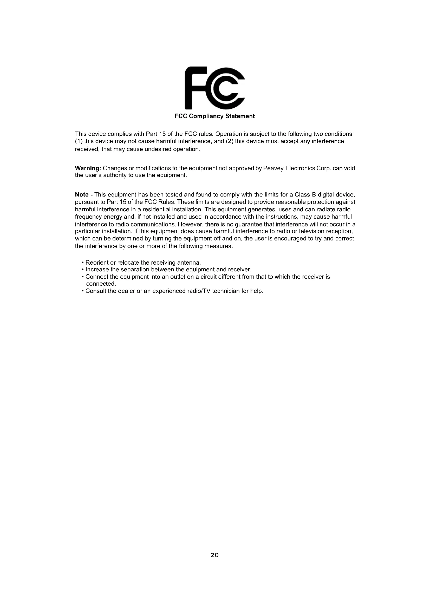 Warning: Changes or modications to the equipment not approved by Peavey Electronics Corp. can void