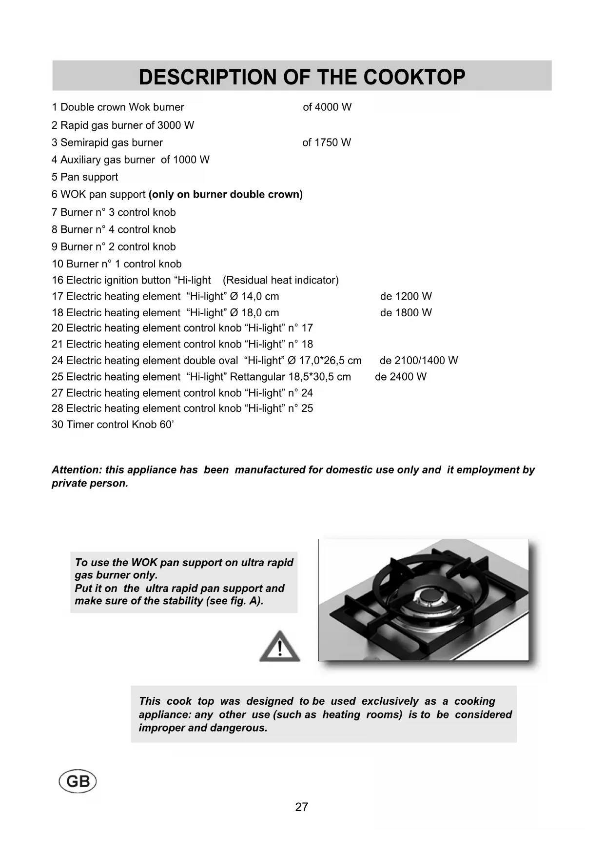 To use the WOK pan support on ultra rapid gas burner only. Put it on the ultra rapid pan support and make sure of the stability (see fig. A). Fig. A This cook top was designed to be used exclusively as a cooking appliance: any other use (such as heating rooms) is to be considered improper and dangerous.28 FIG. 2