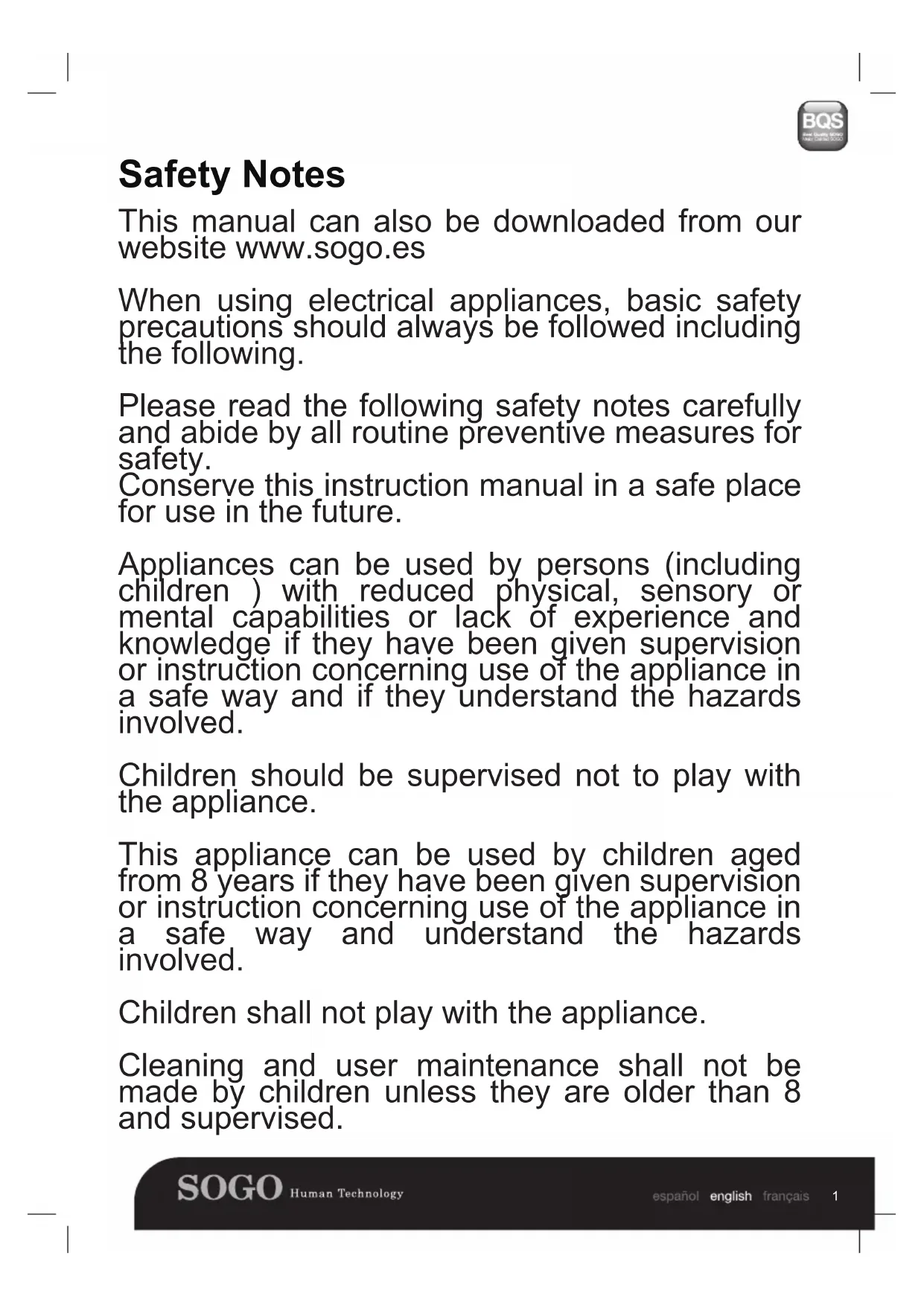 ...... ....................................................................................................21Safety Notes This manual can also be downloaded from our website www.sogo.es When using electrical appliances, basic safety precautions should always be followed including the following. Please read the following safety notes carefully and abide by all routine preventive measures for safety. Conserve this instruction manual in a safe place for use in the future. Appliances can be used by persons (including children ) with reduced physical, sensory or mental capabilities or lack of experience and knowledge if they have been given supervision or instruction concerning use of the appliance in a safe way and if they understand the hazards involved. Children should be supervised not to play with the appliance. This appliance can be used by children aged from 8 years if they have been given supervision or instruction concerning use of the appliance in a safe way and understand the hazards involved. Children shall not play with the appliance. Cleaning and user maintenance shall not be made by children unless they are older than 8 and supervised. 1Safety Notes Dang