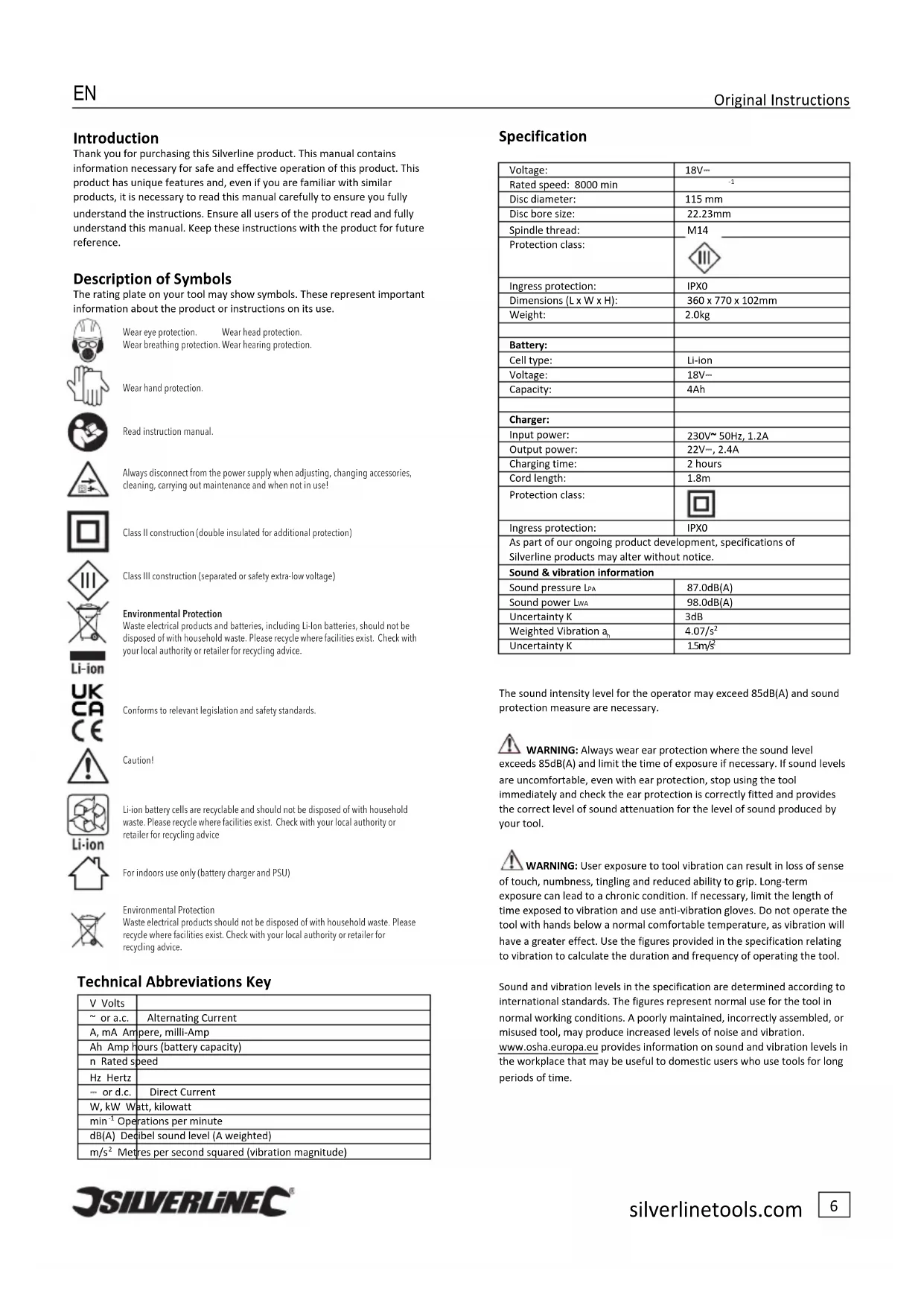 of touch, numbness, tingling and reduced ability to grip. Long-term exposure can lead to a chronic condition. If necessary, limit the length of time exposed to vibration and use anti-vibration gloves. Do not operate the tool with hands below a normal comfortable temperature, as vibration will have a greater effect. Use the figures provided in the specification relating to vibration to calculate the duration and frequency of operating the tool. Sound and vibration levels in the specification are determined according to international standards. The figures represent normal use for the tool in normal working conditions. A poorly maintained, incorrectly assembled, or misused tool, may produce increased levels of noise and vibration. www.osha.europa.eu provides information on sound and vibration levels in the workplace that may be useful to domestic users who use tools for long periods of time. Wear eye protection. Wear breathing protection.Wear head protection.Wear hand protection.Read instruction manual.Always disconnect from the power supply when adjusting, changing accessories, cleaning, carrying out maintenance and when not in use!Class II construction (double insulated for additional protection)Wear hearing protection. Class III construction (separated or safety extra-low voltage) Environmental Protection Waste electrical products and batteries, including Li-Ion batteries, should not be disposed of with household waste. Please recycle where facilities exist. Check with your local authority or retailer for recycling advice.Conforms to relevant legislation and safety standards. Caution!Li-ion battery cells are recyclable and should not be disposed of with household waste. Please recycle where facilities exist. Check with your local authority or retailer for recycling adviceFor indoors use only (battery charger and PSU)Environmental ProtectionWaste electrical products should not be disposed of with household waste. Please recycle where facilities exist. Check with your local authority or retailer for recycling advice.EN Original Instructions silverlinetools.com