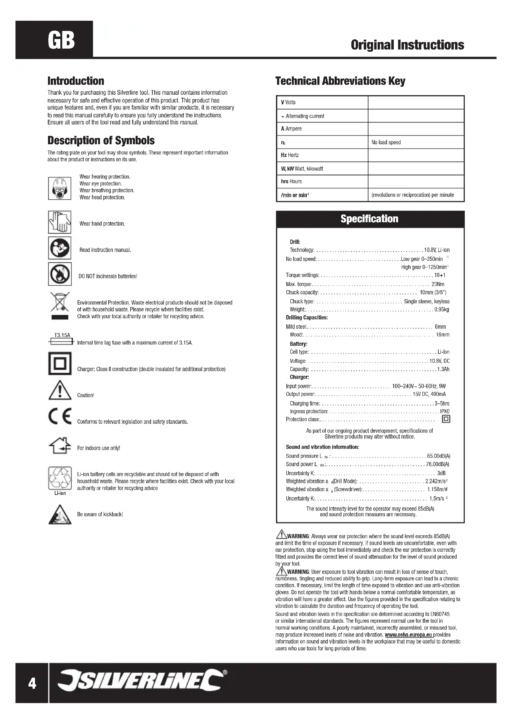 No load speedHz HertzW, kW Watt, kilowatthrs Hours/min or min (revolutions or reciprocation) per minute Introduction Thank you for purchasing this Silverline tool. This manual contains information necessary for safe and effective operation of this product. This product has unique features and, even if you are familiar with similar products, it is necessary to read this manual carefully to ensure you fully understand the instructions. Ensure all users of the tool read and fully understand this manual.Li-ion T3.15A 521457_Z1MANPRO1.indd 4 08/11/2016 11:00www.silverlinetools.com