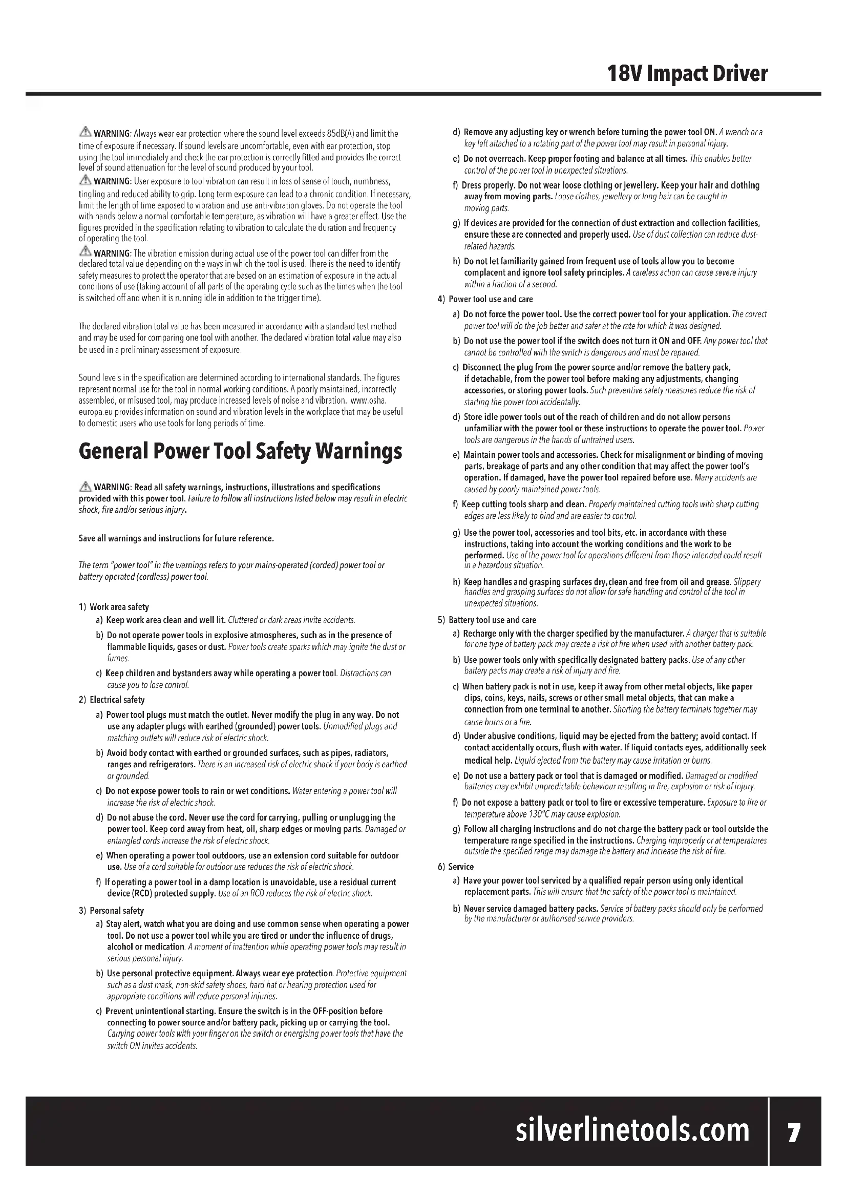 Conforms to relevant legislation and safety standards. Caution!Li-ionbatterycellsarerecyclableandshouldnotbedisposedofwithhouseholdwaste.Pleaserecyclewherefacilitiesexist.Checkwithyourlocalauthorityorretailerfor recycling advice Introduction Thank you for purchasing this Silverline product. This manual contains information necessary for safe and effective operation of this product. This product has unique features and, even ifyouarefamiliarwithsimilarproducts,itisnecessarytoreadthismanualcarefullytoensure you fully understand the instructions. Ensure all users of the product read and fully understandthismanual.Keeptheseinstructionswiththeproductforfuturereference. Original Instructions V Volts~ Alternating currentA, mA Ampere, milli-AmpAh Amp hours (battery capacity)