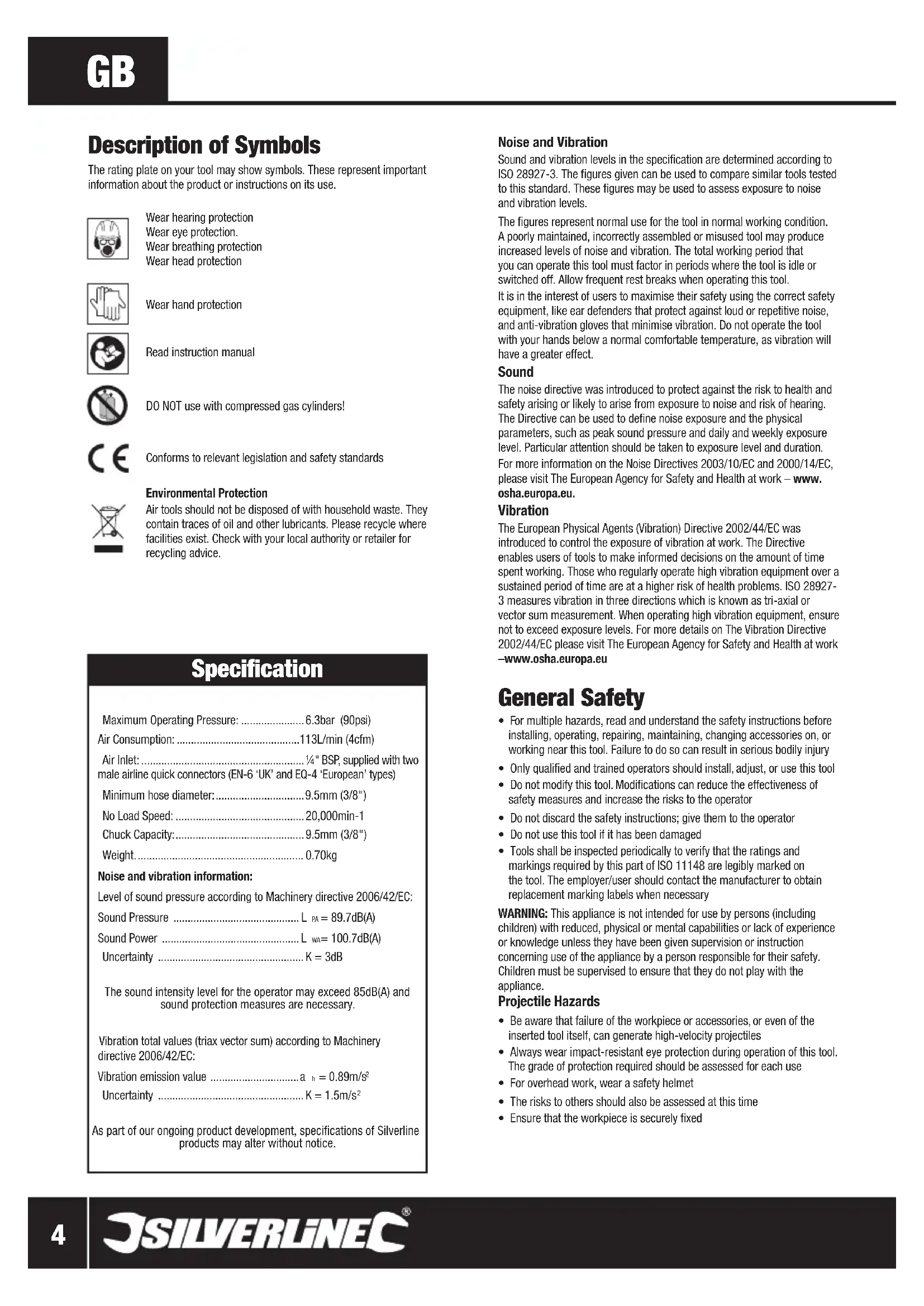 As part of our ongoing product development, specifications of Silverline products may alter without notice. Description of Symbols The rating plate on your tool may show symbols. These represent important information about the product or instructions on its use. Wear hearing protection Wear eye protection. Wear breathing protection Wear head protection Wear hand protection Read instruction manual DO NOT use with compressed gas cylinders! Conforms to relevant legislation and safety standards Environmental Protection Air tools should not be disposed of with household waste. They contain traces of oil and other lubricants. Please recycle where facilities exist. Check with your local authority or retailer for recycling advice. 868625_Z1MANPRO1.indd 4 01/10/2013 17:29www.silverlinetools.com