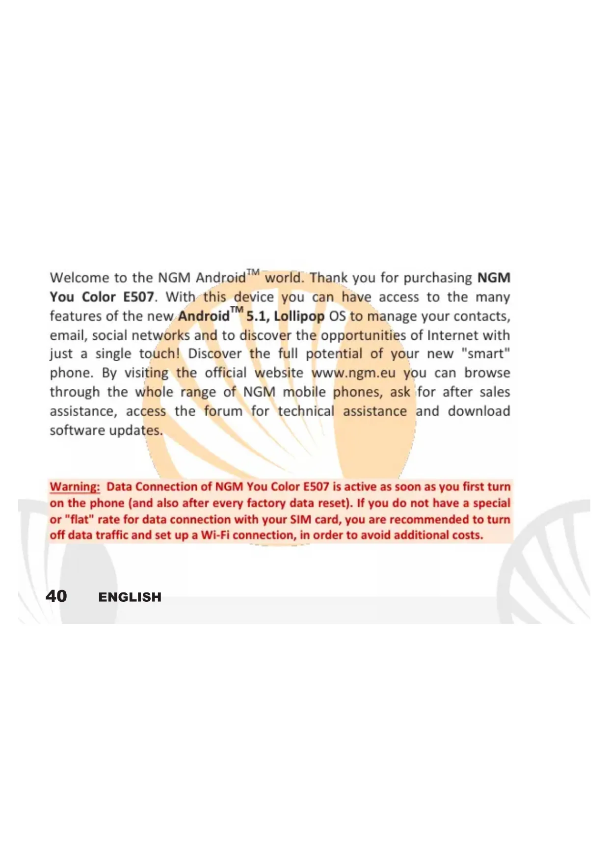 OS functionalities, it is recommended to configure a new Gmail account, or insert an existing one. This will allow you to access all Android™ OS applications.53 ENGLISH E-mail: By configuring a default account you can easily manage your e-mails and display them automatically on your phone. If you want to use also a different Email account, you can configure a new account with another provider within the Email app in the Main Menu. Synchronization: synchronization is the most efficient approach to manage your useful data because it allows you to make a backup of the data on your device with an internet account. In case of replacement, loss or damage of the phone you will not experience loss of data. The synchronization can be activated individually for each synchronized application installed; you can find the application list in Settings > Account[Installed App list]. To add a new account, select Add Account. The synchronization uses an active data connection, which could result in data traffic costs. It is advisable to use a WiFi connection when available. GPS geolocalization: The Global Positioning System (GPS) is a satellite-based positioning system, with a global and continuous coverage. To access GPS, select Settings > Localization I/O. When the GPS function is activated, the phone starts to collect data from satellites and determines the current position. The Fix Times (position detection) are variable and can be affected by several external factors (clouds, high buildings, etc.). Limit the use of battery and memory by switching off this function when you don’t need it.54 ENGLISH NGM You Color E506 Dual SIM With your new smartphone NGM You Color E507 you will enjoy the convenience of Dual SIM, that is the ability to handle two SIM cards and consequently two telephone numbers with a single device. You will discover useful features such as setting the preferred SIM for calls, messages and data connection and the possibility to quickly move the data connection, and automatically the 3G, from one SIM to the other without physically having to exchange them. At any time you can manage ringtones and notifications for each SIM card independently, exactly as if you had two separate devices. Managing the two SIM cards: from the main menu, select Settings > SIM Management. Select the on/off keys next to the phone operators corresponding to "SIM1" and "SIM2" to activate or deactivate selectively the SIM at any time. From this menu you can also customize the color and name for each SIM icon and decide which SIM to use as default for calls, messages and data connection or choose "always ask" if you don't want to set a SIM card as default. By selecting a SIM for data connection, the 3G service will be automatically activated on the same SIM. This allows you to move the 3G connection (normally available on slot1 only) from one SIM to the other without physically exchanging them.55 ENGLISH Set up Inserting the SIM cards: to access the compartment containing the SIM slots, turn off the phone and lift up the cover starting from the slit on the bottom right corner. Remove the battery and insert the SIM cards into the slots with their gold contacts facing downwards.
