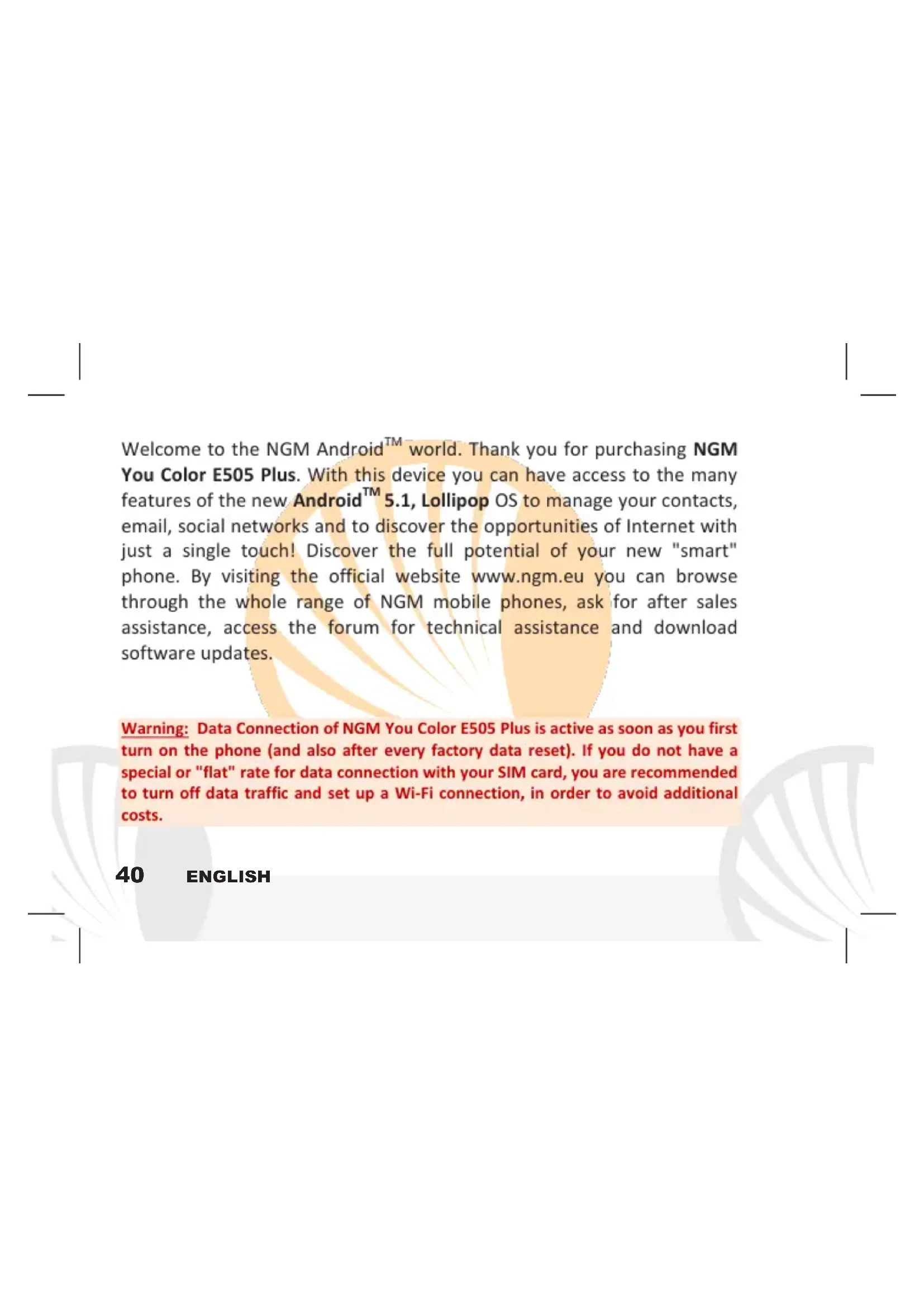 Warning: Data Connection of NGM You Color E505 Plus is active as soon as you first