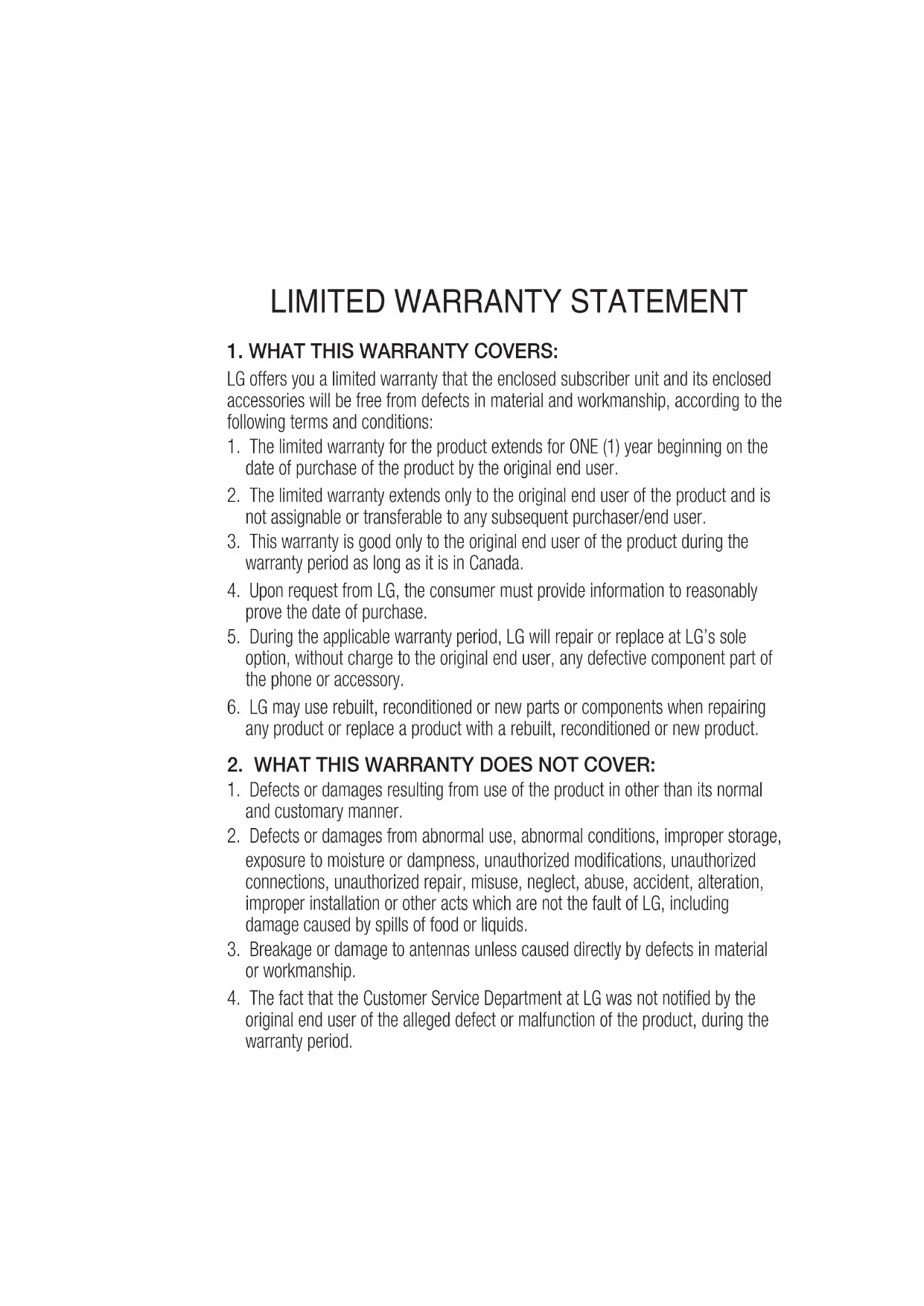 No other express warranty is applicable to this product. THE DURATION OF ANY IMPLIED WARRANTIES, INCLUDING THE IMPLIED WARRANTY OF MARKETABILITY, IS LIMITED TO THE DURATION OF THE EXPRESS WARRANTY HEREIN. LG ELECTRONICS CANADA, INC. SHALL NOT BE LIABLE FOR THE LOSS OF THE USE OF THE PRODUCT, INCONVENIENCE, LOSS OR ANY OTHER DAMAGES, DIRECT OR CONSEQUENTIAL, ARISING OUT OF THE USE OF, OR INABILITY TO USE, THIS PRODUCT OR FOR ANY BREACH OF ANY EXPRESS OR IMPLIED WARRANTY, INCLUDING THE IMPLIED WARRANTY OF MARKETABILITY APPLICABLE TO THIS PRODUCT.