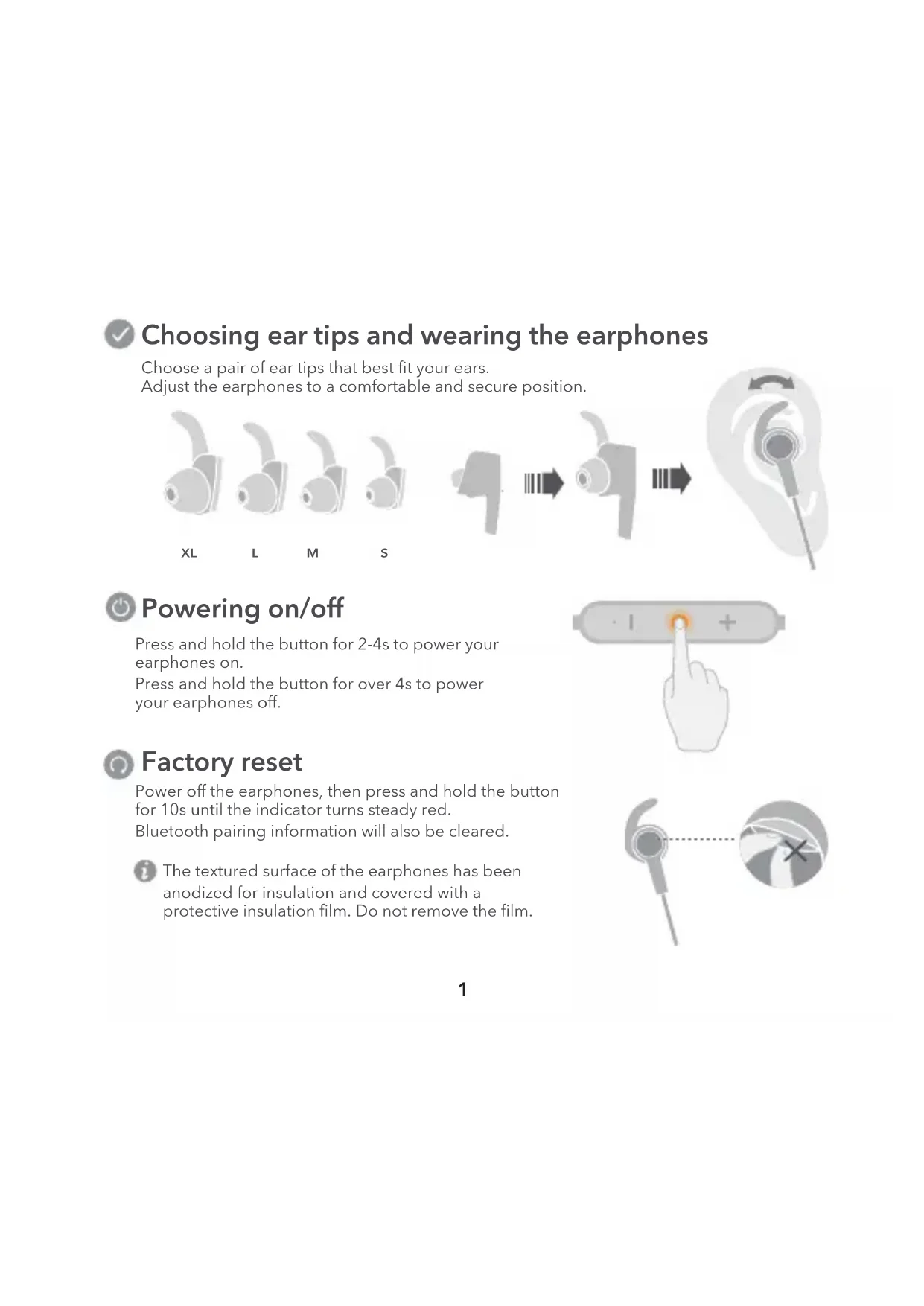 NederlandsChoosing ear tips and wearing the earphones Choose a pair of ear tips that best fit your ears. Adjust the earphones to a comfortable and secure position. Powering on/off Factory reset Press and hold the button for 2-4s to power your earphones on. Press and hold the button for over 4s to power your earphones off. Power off the earphones, then press and hold the button for 10s until the indicator turns steady red. Bluetooth pairing information will also be cleared. The textured surface of the earphones has been anodized for insulation and covered with a protective insulation film. Do not remove the film.