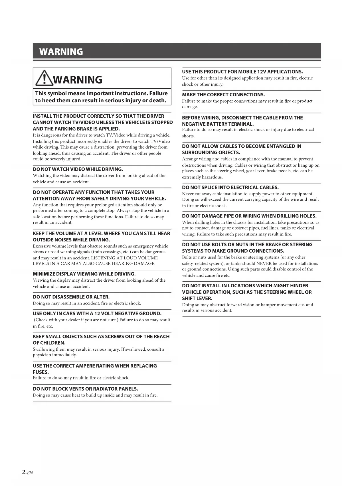 - Specifications ALPINE iLX-F905D 68-41657Z79-B_QRG (EN) ALPINE iLX-F905D 68-41657Z79-B_QRG (EN) 2-EN WARNING WARNING This symbol means important instructions. Failure to heed them can result in serious injury or death. INSTALL THE PRODUCT CORRECTLY SO THAT THE DRIVER CANNOT WATCH TV/VIDEO UNLESS THE VEHICLE IS STOPPED AND THE PARKING BRAKE IS APPLIED.It is dangerous for the driver to watch TV/Video while driving a vehicle. Installing this product incorrectly enables the driver to watch TV/Video while driving. This may cause a distraction, preventing the driver from looking ahead, thus causing an accident. The driver or other people could be severely injured.DO NOT WATCH VIDEO WHILE DRIVING.Watching the video may distract the driver from looking ahead of the vehicle and cause an accident.DO NOT OPERATE ANY FUNCTION THAT TAKES YOUR ATTENTION AWAY FROM SAFELY DRIVING YOUR VEHICLE.Any function that requires your prolonged attention should only be performed after coming to a complete stop. Always stop the vehicle in a safe location before performing these functions. Failure to do so may result in an accident.KEEP THE VOLUME AT A LEVEL WHERE YOU CAN STILL HEAR OUTSIDE NOISES WHILE DRIVING.Excessive volume levels that obscure sounds such as emergency vehicle sirens or road warning signals (train crossings, etc.) can be dangerous and may result in an accident. LISTENING AT LOUD VOLUME LEVELS IN A CAR MAY ALSO CAUSE HEARING DAMAGE.MINIMIZE DISPLAY VIEWING WHILE DRIVING.Viewing the display may distract the driver from looking ahead of the vehicle and cause an accident.DO NOT DISASSEMBLE OR ALTER.Doing so may result in an accident, fire or electric shock.USE ONLY IN CARS WITH A 12 VOLT NEGATIVE GROUND. (Check with your dealer if you are not sure.) Failure to do so may result in fire, etc.KEEP SMALL OBJECTS SUCH AS SCREWS OUT OF THE REACH OF CHILDREN.Swallowing them may result in serious injury. If swallowed, consult a physician immediately.USE THE CORRECT AMPERE RATING WHEN REPLACING FUSES.Failure to do so may result in fire or electric shock.DO NOT BLOCK VENTS OR RADIATOR PANELS.Doing so may cause heat to build up inside and may result in fire.USE THIS PRODUCT FOR MOBILE 12V APPLICATIONS.Use for other than its designed application may result in fire, electric shock or other injury.MAKE THE CORRECT CONNECTIONS.Failure to make the proper connections may result in fire or product damage.BEFORE WIRING, DISCONNECT THE CABLE FROM THE NEGATIVE BATTERY TERMINAL.Failure to do so may result in electric shock or injury due to electrical shorts.DO NOT ALLOW CABLES TO BECOME ENTANGLED IN SURROUNDING OBJECTS.Arrange wiring and cables in compliance with the manual to prevent obstructions when driving. Cables or wiring that obstruct or hang up on places such as the steering wheel, gear lever, brake pedals, etc. can be extremely hazardous.DO NOT SPLICE INTO ELECTRICAL CABLES.Never cut away cable insulation to supply power to other equipment. Doing so will exceed the current carrying capacity of the wire and result in fire or electric shock.DO NOT DAMAGE PIPE OR WIRING WHEN DRILLING HOLES.When drilling holes in the chassis for installation, take precautions so as not to contact, damage or obstruct pipes, fuel lines, tanks or electrical wiring. Failure to take such precautions may result in fire.DO NOT USE BOLTS OR NUTS IN THE BRAKE OR STEERING SYSTEMS TO MAKE GROUND CONNECTIONS.Bolts or nuts used for the brake or steering systems (or any other safety-related system), or tanks should NEVER be used for installations or ground connections. Using such parts could disable control of the vehicle and cause fire etc.DO NOT INSTALL IN LOCATIONS WHICH MIGHT HINDER VEHICLE OPERATION, SUCH AS THE STEERING WHEEL OR SHIFT LEVER.Doing so may obstruct forward vision or hamper movement etc. and results in serious accident. CAUTION This symbol means important instructions. Failure to heed them can result in injury or material property damage. HALT USE IMMEDIATELY IF A PROBLEM APPEARS. Failure to do so may cause personal injury or damage to the product. Return it to your authorized Alpine dealer or the nearest Alpine Service Center for repairing. HAVE THE WIRING AND INSTALLATION DONE BY EXPERTS. The wiring and installation of this unit requires special technical skill and experience. To ensure safety, always contact the dealer where you purchased this product to have the work done. USE SPECIFIED ACCESSORY PARTS AND INSTALL THEM SECURELY. Be sure to use only the specified accessory parts. Use of other than designated parts may damage this unit internally or may not securely install the unit in place. This may cause parts to become loose resulting in hazards or product failure. ARRANGE THE WIRING SO IT IS NOT CRIMPED OR PINCHED BY A SHARP METAL EDGE. Route the cables and wiring away from moving parts (like the seat rails) or sharp or pointed edges. This will prevent crimping and damage to the wiring. If wiring passes through a hole in metal, use a rubber grommet to prevent the wire’s insulation from being cut by the metal edge of the hole. DO NOT INSTALL IN LOCATIONS WITH HIGH MOISTURE OR DUST. Avoid installing the unit in locations with high incidence of moisture or dust. Moisture or dust that penetrates into this unit may result in product failure.ALPINE iLX-F905D 68-41657Z79-B_QRG (EN) ALPINE iLX-F905D 68-41657Z79-B_QRG (EN) 3-EN p. 21