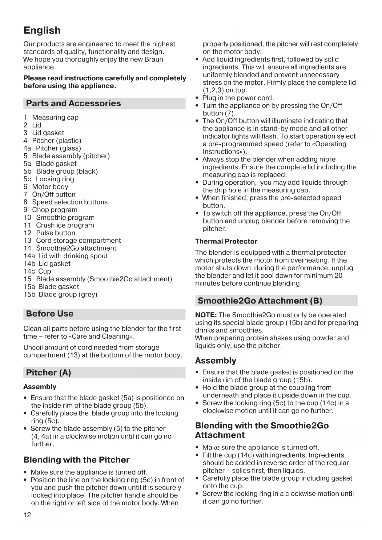 5722310394_JB_7xxx_USCA.indd 11 21.12.17 14:0812 English Our products are engineered to meet the highest standards of quality, functionality and design. We hope you thoroughly enjoy the new Braun appliance. Please read instructions carefully and completely before using the appliance. Parts and Accessories 1 Measuring cap 2 Lid 3 Lid gasket 4 Pitcher (plastic) 4a Pitcher (glass) 5 Blade assembly (pitcher) 5a Blade gasket 5b Blade group (black) 5c Locking ring 6 Motor body 7 On/Off button 8 Speed selection buttons 9 Chop program 10 Smoothie program 11 Crush ice program 12 Pulse button 13 Cord storage compartment 14 Smoothie2Go attachment 14a Lid with drinking spout 14b Lid gasket 14c Cup 15 Blade assembly (Smoothie2Go attachment) 15a Blade gasket 15b Blade group (grey) Before Use Clean all parts before using the blender for the first time – refer to «Care and Cleaning». Uncoil amount of cord needed from storage compartment (13) at the bottom of the motor body. Pitcher (A) Assembly