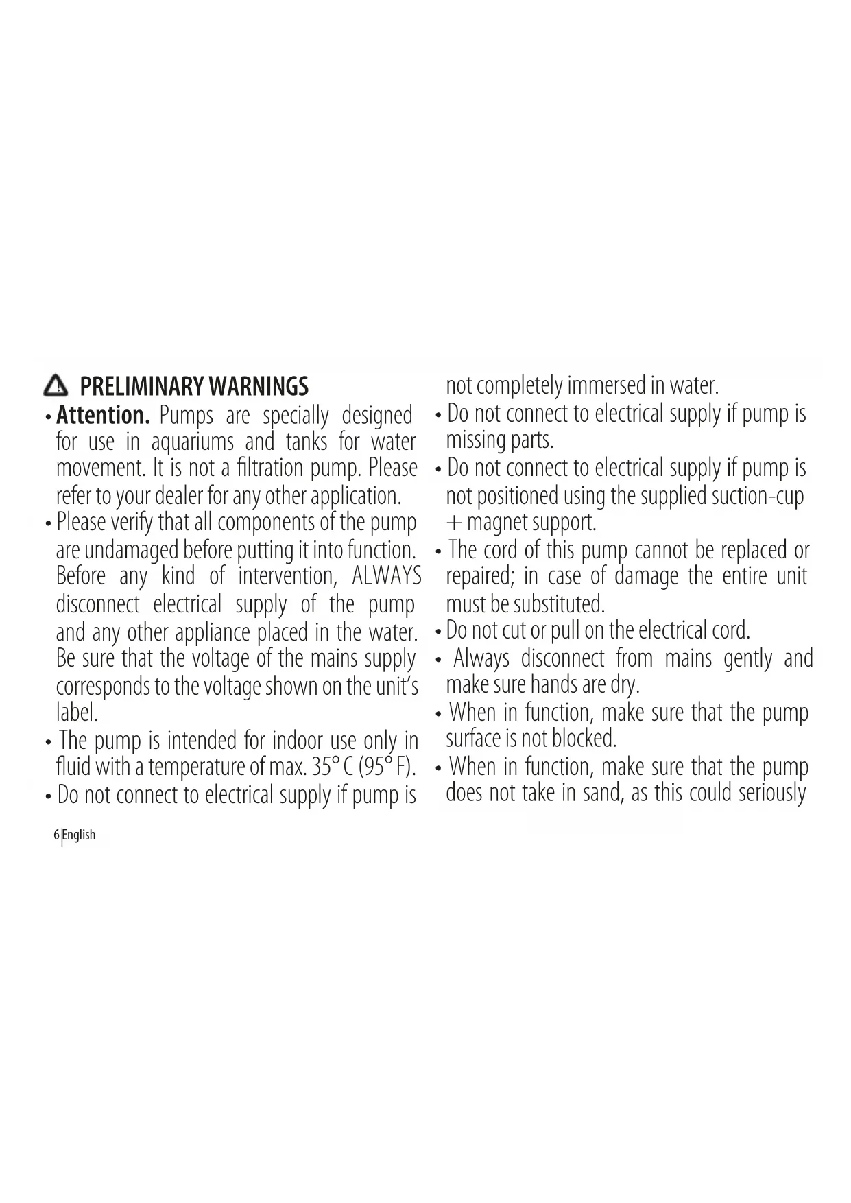 - Attention. Pumps are specially designed for use in aquariums and tanks for water movement. It is not a ltration pump. Please refer to your dealer for any other application.