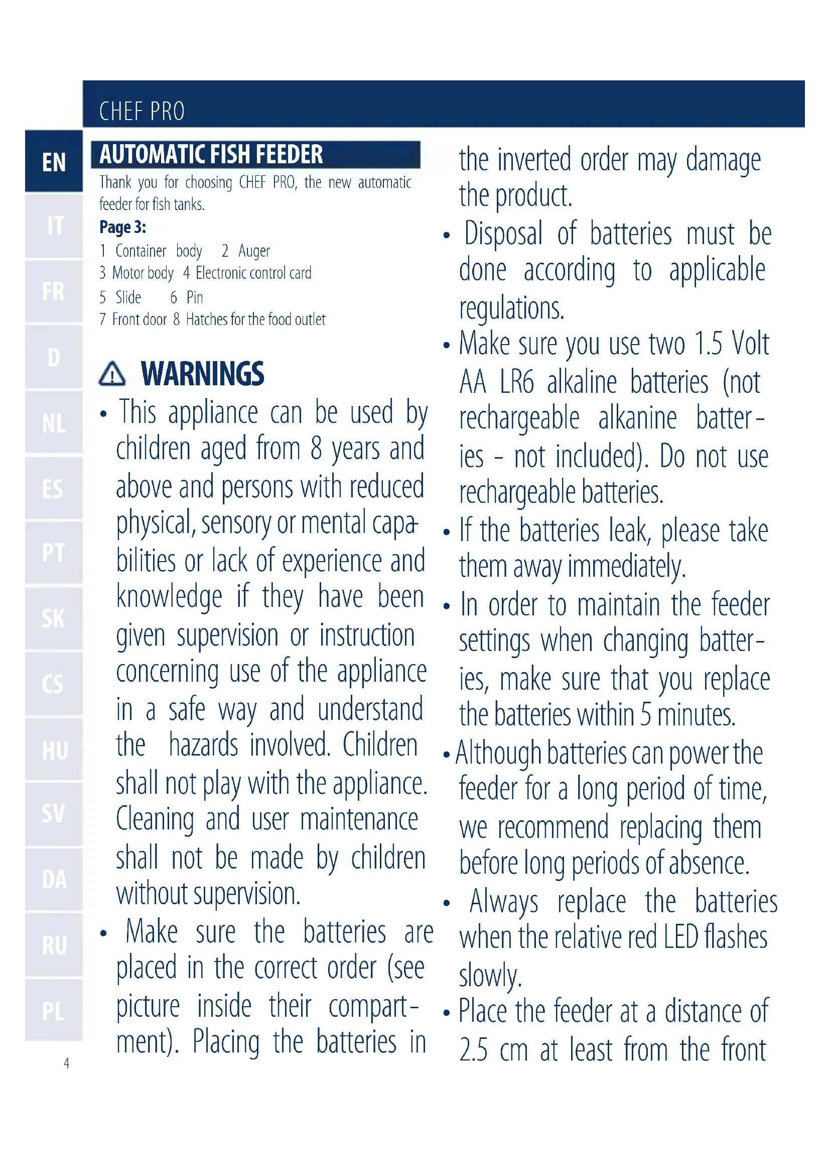 Thank you for choosing CHEF PRO, the new automatic feeder for fish tanks. Page 3: 1 Container body 2 Auger 3 Motor body 4 Electronic control card 5 Slide 6 Pin 7 Front door 8 Hatches for the food outlet