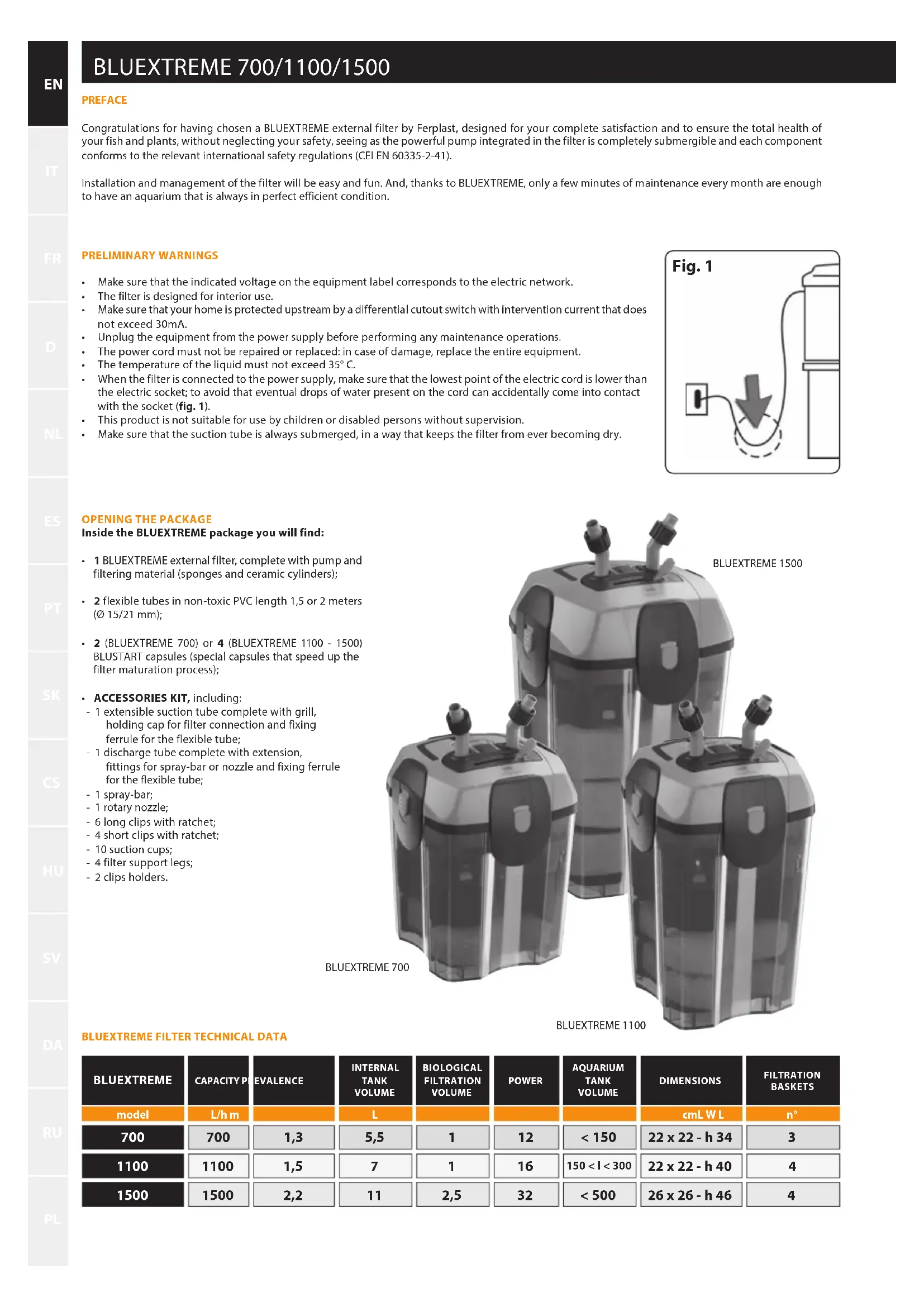 PREFACE Congratulations for having chosen a BLUEXTREME external filter by Ferplast, designed for your complete satisfaction and to ensure the total health of your fish and plants, without neglecting your safety, seeing as the powerful pump integrated in the filter is completely submergible and each component conforms to the relevant international safety regulations (CEI EN 60335-2-41). Installation and management of the filter will be easy and fun. And, thanks to BLUEXTREME, only a few minutes of maintenance every month are enough to have an aquarium that is always in perfect efficient condition. Fig. 1