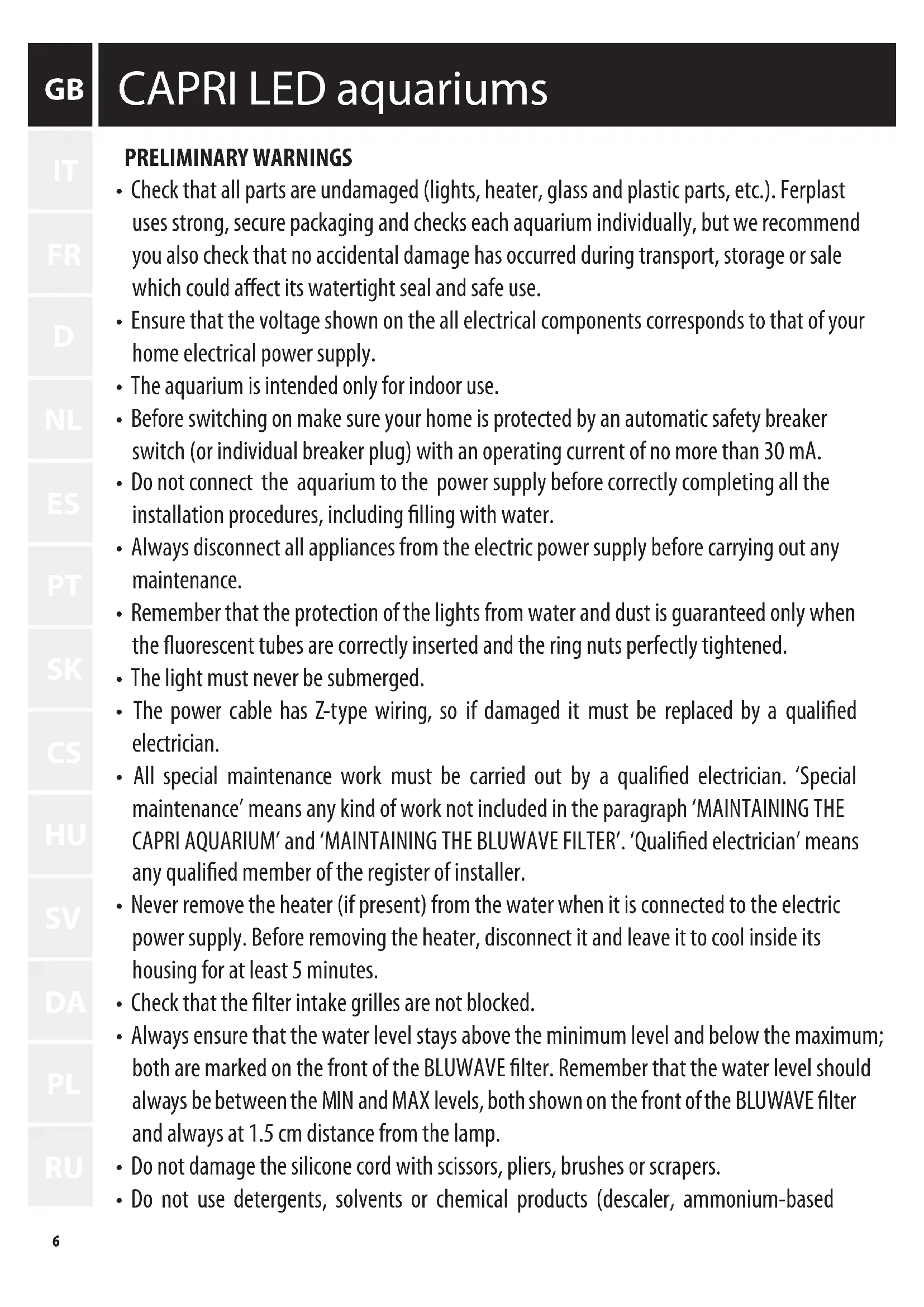 364432-1_FI CAPRI LED_48pagine.indd 6 18/05/17 17:15CAPRI LED aquariums products, etc.) to clean the glass, as they could damage the silicone, causing it to become detached (possibly some time later).