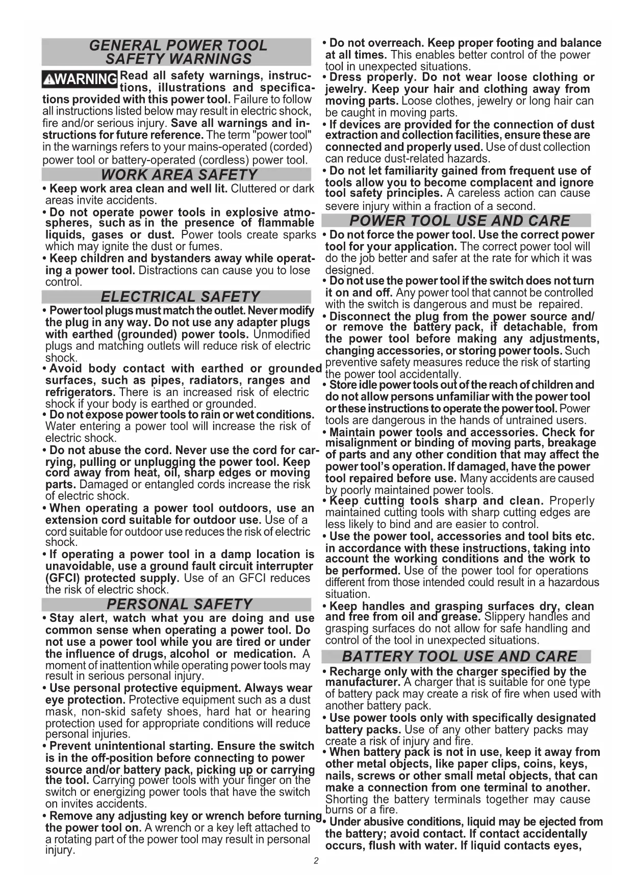 Monday-Friday, 7:00 AM - 4:30 PM CST or visit www.milwaukeetool.ca LIMITED WARRANTY USA & CANADA Every MILWAUKEE power tool* (see exceptions below) is warranted to the original purchaser only to be free from defects in material and workmanship. Subject to certain exceptions, MILWAUKEE will repair or replace any part on an electric power tool which, after examination, is determined by MILWAUKEE to be defective in material or workmanship for a period of ve (5) years** after the date of purchase unless otherwise noted. Return of the power tool to a MILWAUKEE factory Service Center location or MILWAUKEE Authorized Service Station, freight prepaid and insured, is required. A copy of the proof of purchase should be included with the return product. This warranty does not apply to damage that MILWAUKEE determines to be from repairs made or attempted by anyone other than MILWAUKEE authorized personnel, misuse, alterations, abuse, normal wear and tear, lack of maintenance, or accidents.Normal Wear: Many power tools need periodic parts replacement and service to achieve best performance. This warranty does not cover repair when nor-mal use has exhausted the life of a part including, but not limited to, chucks, brushes, cords, saw shoes, blade clamps, o-rings, seals, bumpers, driver blades, pistons, strikers, lifters, and bumper cover washers.*This warranty does not cover Air Nailers & Staplers; Airless Paint Sprayer; Cordless Battery Packs; Gasoline Driven Portable Power Generators; Hand Tools; Hoist – Electric, Lever & Hand Chain; M12™ Heated Gear; Recondi-tioned Product; and Test & Measurement Products. There are separate and distinct warranties available for these products.**The warranty period for Job Site Radios, M12™ Power Port, M18™ Power Source, Jobsite Fan and Trade Titan™ Industrial Work Carts is one (1) year from the date of purchase. The warranty period for the M18 FUEL™ 1" D-Handle High Torque Impact Wrenches, Drain Cleaning Cables, AIRSNAKE™ Drain Cleaning Air Gun Accessories, and REDLITHIUM™ USB Laser Levels is two (2) years from the date of purchase. The warranty period for the M18™ Compact Heat Gun, 8 Gallon Dust Extractor, M18™ Framing Nailers, M18 FUEL™ 1/2" Ext. Anvil Controlled Torque Impact Wrench w/ ONE-KEY™, M18 FUEL™ 1" High Torque Impact Wrench w/ ONE-KEY™, M18 FUEL™ 2 Gal. Compact Quiet Compressor, M12™ Laser Levels, 165' Laser Detector, M12™ 23GA Pin Nailer, and M18 FUEL™ 1/4" Blind Rivet Tool w/ ONE-KEY™, and M12 FUEL™ Low Speed Tire Buer is three (3) years from the date of purchase. The warranty period for the LED in the LED Work Light and the LED Upgrade Bulb for the Work Light is the lifetime of the product subject to the limitations above. If during normal use the LED or LED Bulb fails, the part will be replaced free of charge. Warranty Registration is not necessary to obtain the applicable warranty on a MILWAUKEE power tool product. The manufacturing date of the product will be used to determine the warranty period if no proof of purchase is provided at the time warranty service is requested.ACCEPTANCE OF THE EXCLUSIVE REPAIR AND REPLACEMENT REMEDIES DESCRIBED HEREIN IS A CONDITION OF THE CONTRACT FOR THE PURCHASE OF EVERY MILWAUKEE PRODUCT. IF YOU DO NOT AGREE TO THIS CONDITION, YOU SHOULD NOT PURCHASE THE PRODUCT. IN NO EVENT SHALL MILWAUKEE BE LIABLE FOR ANY INCIDENTAL, SPECIAL, CONSEQUENTIAL OR PUNITIVE DAMAGES, OR FOR ANY COSTS, ATTORNEY FEES, EXPENSES, LOSSES OR DELAYS ALLEGED TO BE AS A CONSEQUENCE OF ANY DAMAGE TO, FAILURE OF, OR DEFECT IN ANY PRODUCT INCLUDING, BUT NOT LIMITED TO, ANY CLAIMS FOR LOSS OF PROFITS. SOME STATES DO NOT ALLOW THE EXCLUSION OR LIMITATION OF INCIDENTAL OR CONSEQUENTIAL DAMAGES, SO THE ABOVE LIMITATION OR EXCLUSION MAY NOT APPLY TO YOU. THIS WARRANTY IS EXCLUSIVE AND IN LIEU OF ALL OTHER EXPRESS WARRANTIES, WRITTEN OR ORAL. TO THE EXTENT PERMITTED BY LAW, MILWAUKEE DISCLAIMS ANY IMPLIED WARRAN-TIES, INCLUDING WITHOUT LIMITATION ANY IMPLIED WARRANTY OF MERCHANTABILITY OR FITNESS FOR A PARTICULAR USE OR PURPOSE; TO THE EXTENT SUCH DISCLAIMER IS NOT PERMITTED BY LAW, SUCH IMPLIED WARRANTIES ARE LIMITED TO THE DURATION OF THE APPLICABLE EXPRESS WARRANTY AS DESCRIBED ABOVE. SOME STATES DO NOT ALLOW LIMITATIONS ON HOW LONG AN IMPLIED WARRANTY LASTS, SO THE ABOVE LIMITATION MAY NOT APPLY TO YOU, THIS WARRANTY GIVES YOU SPECIFIC LEGAL RIGHTS, AND YOU MAY ALSO HAVE OTHER RIGHTS WHICH VARY FROM STATE TO STATE.This warranty applies to product sold in the U.S.A. and Canada only.Please consult the ‘Service Center Search’ in the Parts & Service section of MILWAUKEE’s website www.milwaukeetool.com or call 1.800.SAWDUST (1.800.729.3878) to locate your nearest service facility for warranty and non-warranty service on a Milwaukee electric power tool. RÈGLES DE SÉCURITÉ GÉNÉRALES