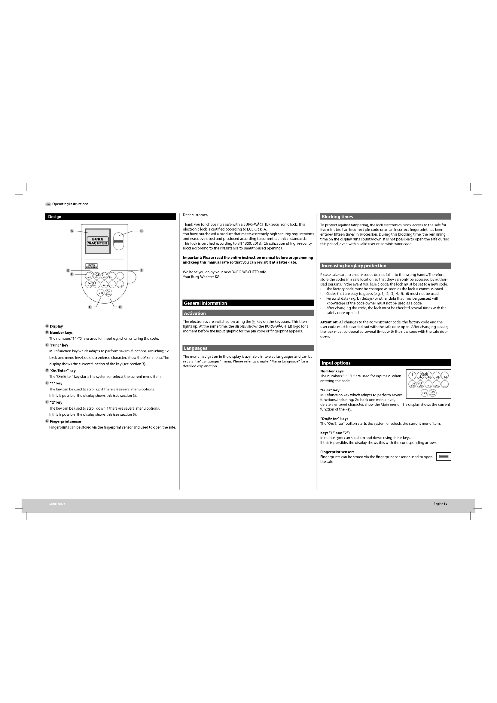 Display Number keys The numbers “1“ - “0“ are used for input e.g. when entering the code. “Func“ key Multifunction key which adapts to perform several functions, including; Go back one menu level, delete a entered character, show the Main menu. The display shows the current function of the key (see section 3). “On/Enter“ key The “On/Enter“ key starts the system or selects the current menu item. “1“ key The key can be used to scroll up if there are several menu options. If this is possible, the display shows this (see section 3). “2“ key The key can be used to scroll down if there are several menu options. If this is possible, the display shows this (see section 3). Fingerprint sensor Fingerprints can be stored via the ngerprint sensor and used to open the safe. Dear customer, Thank you for choosing a safe with a BURG-WÄCHTER SecuTronic lock. This electronic lock is certied according to ECB Class A. You have purchased a product that meets extremely high security requirements and was developed and produced according to current technical standards. This lock is certied according to EN 1300: 2018. (Classication of high-security locks according to their resistance to unauthorised opening). Important: Please read the entire instruction manual before programming and keep this manual safe so that you can revisit it at a later date. We hope you enjoy your new BURG-WÄCHTER safe. Your Burg-Wächter KG Activation Languages The electronics are switched on using the