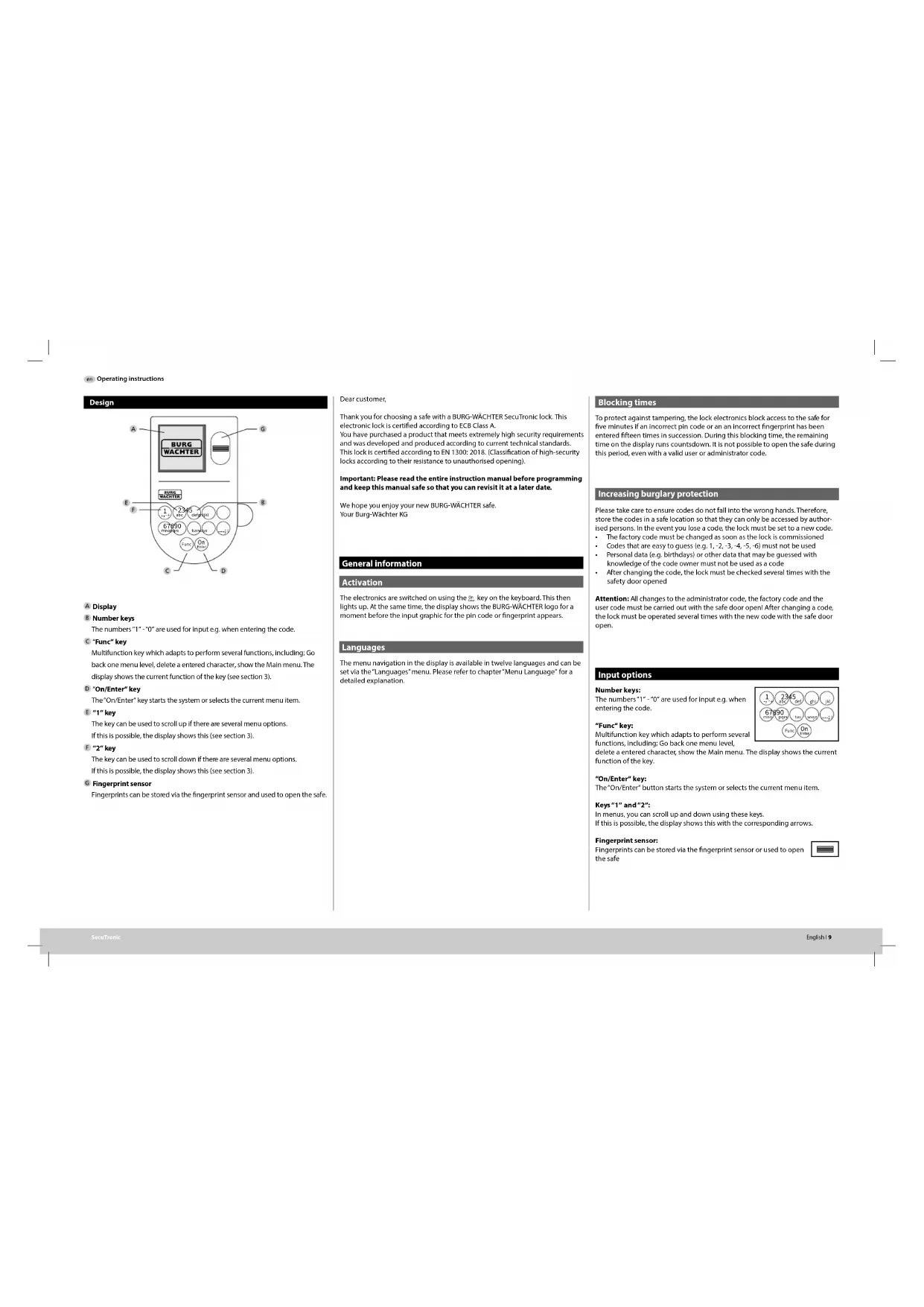 Display Number keys The numbers “1“ - “0“ are used for input e.g. when entering the code. “Func“ key Multifunction key which adapts to perform several functions, including; Go back one menu level, delete a entered character, show the Main menu. The display shows the current function of the key (see section 3). “On/Enter“ key The “On/Enter“ key starts the system or selects the current menu item. “1“ key The key can be used to scroll up if there are several menu options. If this is possible, the display shows this (see section 3). “2“ key The key can be used to scroll down if there are several menu options. If this is possible, the display shows this (see section 3). Fingerprint sensor Fingerprints can be stored via the ngerprint sensor and used to open the safe. Dear customer, Thank you for choosing a safe with a BURG-WÄCHTER SecuTronic lock. This electronic lock is certied according to ECB Class A. You have purchased a product that meets extremely high security requirements and was developed and produced according to current technical standards. This lock is certied according to EN 1300: 2018. (Classication of high-security locks according to their resistance to unauthorised opening). Important: Please read the entire instruction manual before programming and keep this manual safe so that you can revisit it at a later date. We hope you enjoy your new BURG-WÄCHTER safe. Your Burg-Wächter KG Activation Languages The electronics are switched on using the