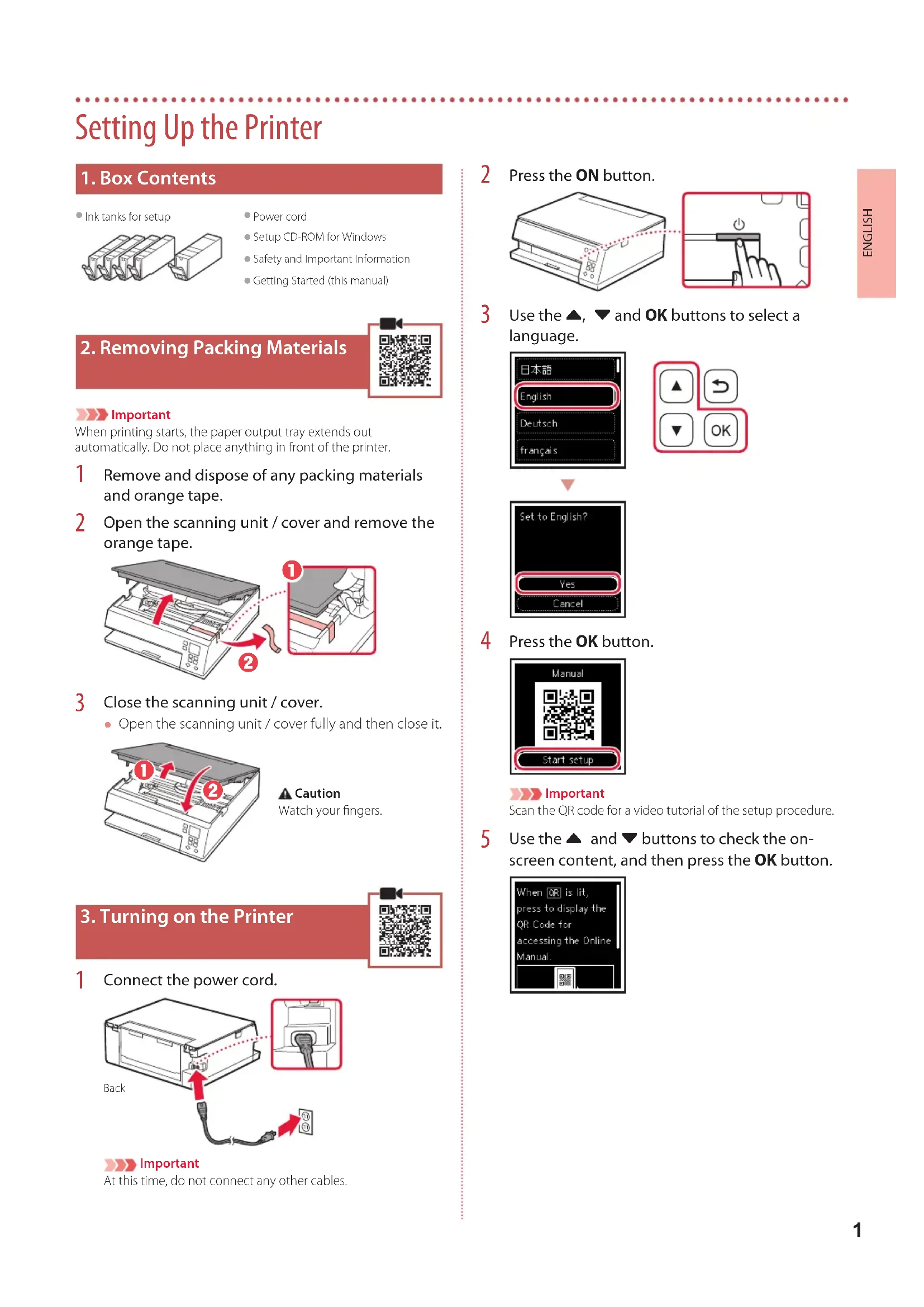 Ink tanks for setup Power cord Setup CD-ROM for Windows Safety and Important Information Getting Started (this manual)