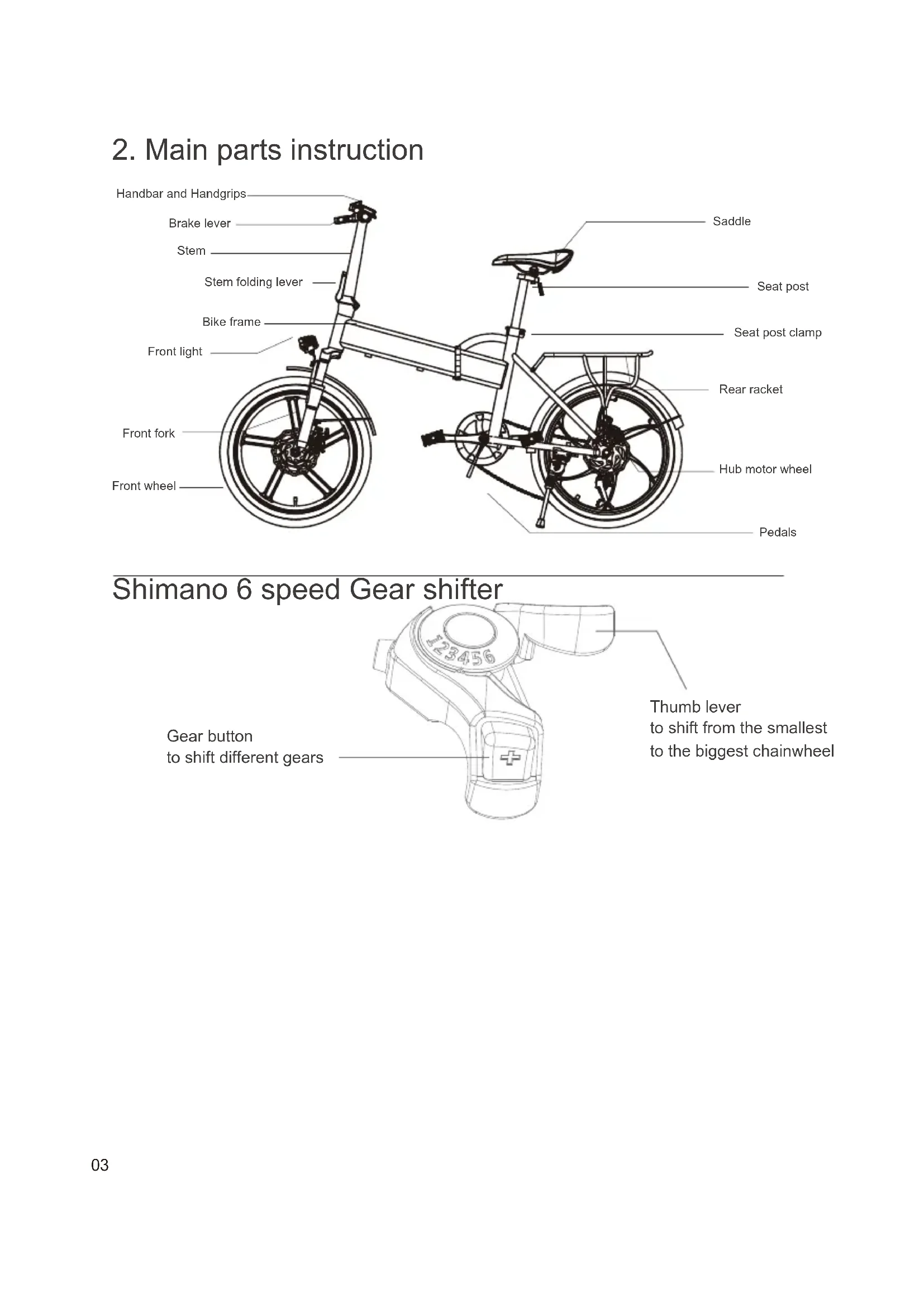 Shimano 6 speed Gear shifter Handbar and Handgrips Saddle Seat post Seat post clamp Rear racket Hub motor wheel Pedals Brake lever Stem Stem folding lever Bike frame Front light Front fork Front wheel Gear button to shift different gears Thumb lever to shift from the smallest to the biggest chainwheel04
