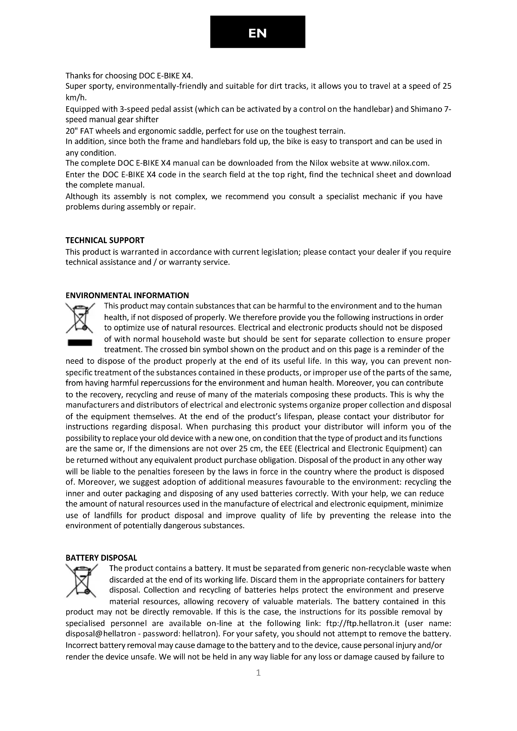 Download the instructions for your Electric bike in PDF format for free! Find your manual X4 - NILOX and take your electronic device back in hand. On this page are published all the documents necessary for the use of your device. X4 by NILOX.