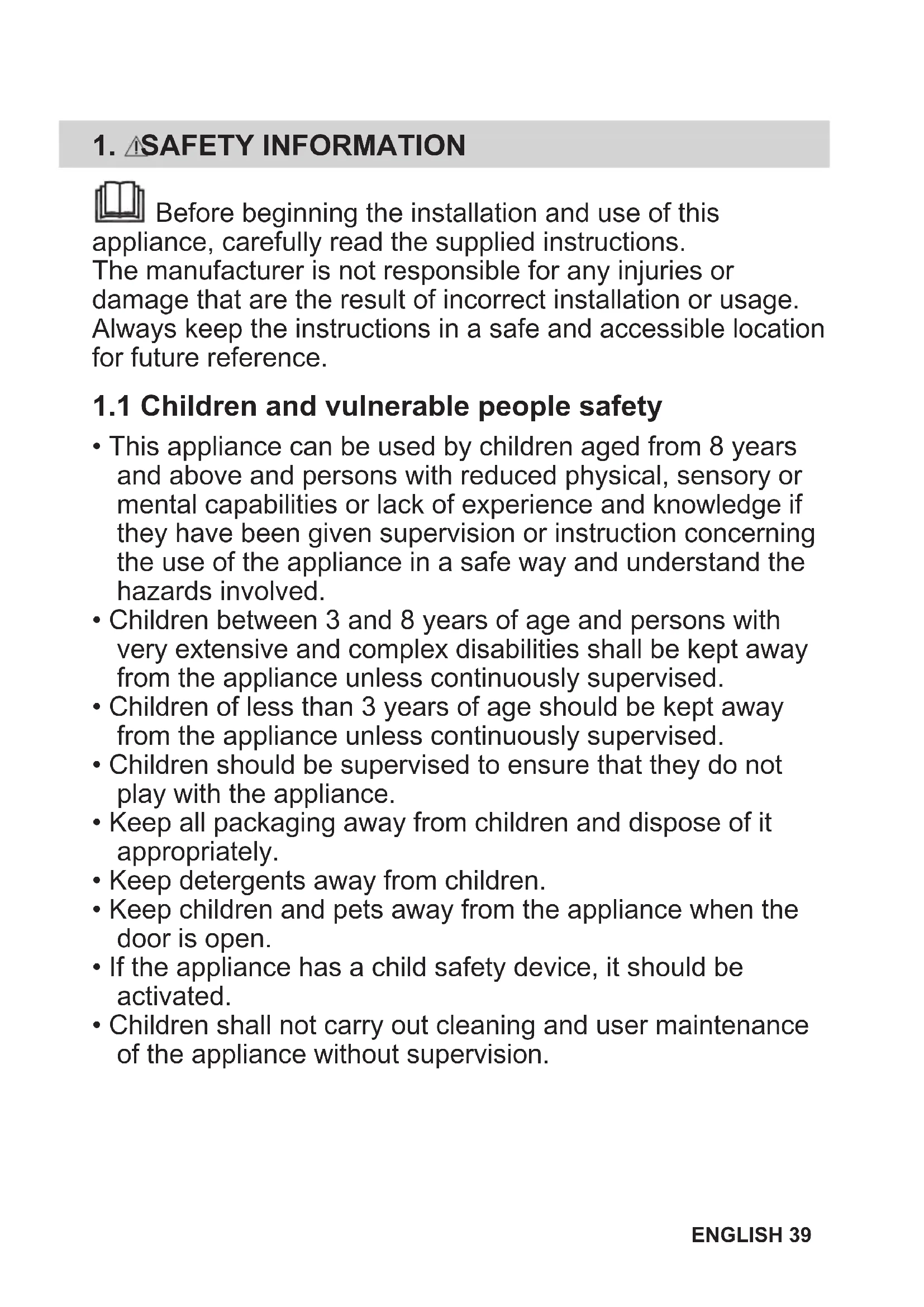 - Children shall not carry out cleaning and user maintenance of the appliance without supervision. ENGLISH 391.2 General Safety